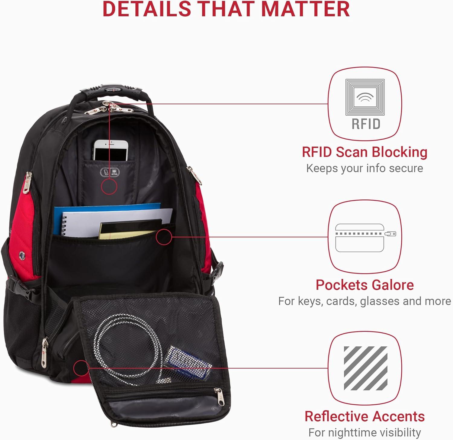 SwissGear 1900 ScanSmart 17” Laptop Backpack Grey/Black – Reflective Tech Backpack with ScanSmart Compartment – Multiple Organizer Pockets & RFID Scan Blocking Technology(Red/Black)