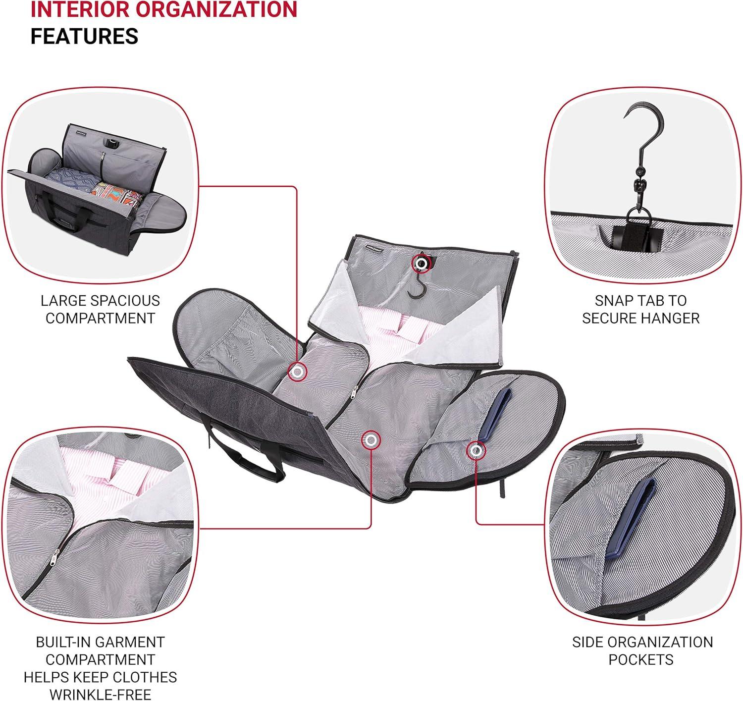 Hanging Garment Feature & Organization: The hanging garment feature includes a removeable hook to hang this bag in your hotel closet without having to wrinkle formal attire.