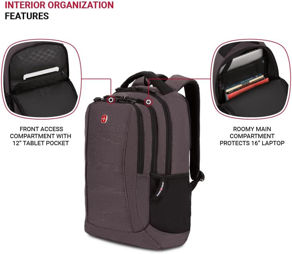 Looking for a stylish and practical backpack? The Swissgear 5668 Laptop Backpack has got you covered. With room for laptops up to 16 inches and a special pocket for tablets up to 12 inches, you can easily carry all your essentials. Plus, this transport backpack's multiple compartments make it easy to organize everything from files to snacks. But what about comfort? The AirFlow back panel is made of high-density foam, providing all-day comfort no matter where you go. And if you're a frequent traveler, the Add-a-Bag strap makes it easy to take with you on all your adventures. The rugged heather material looks incredible and is sure to upgrade your style game. So whether you're heading to work, school, or just out for some fun, this versatile commuter backpack is the perfect choice for you.