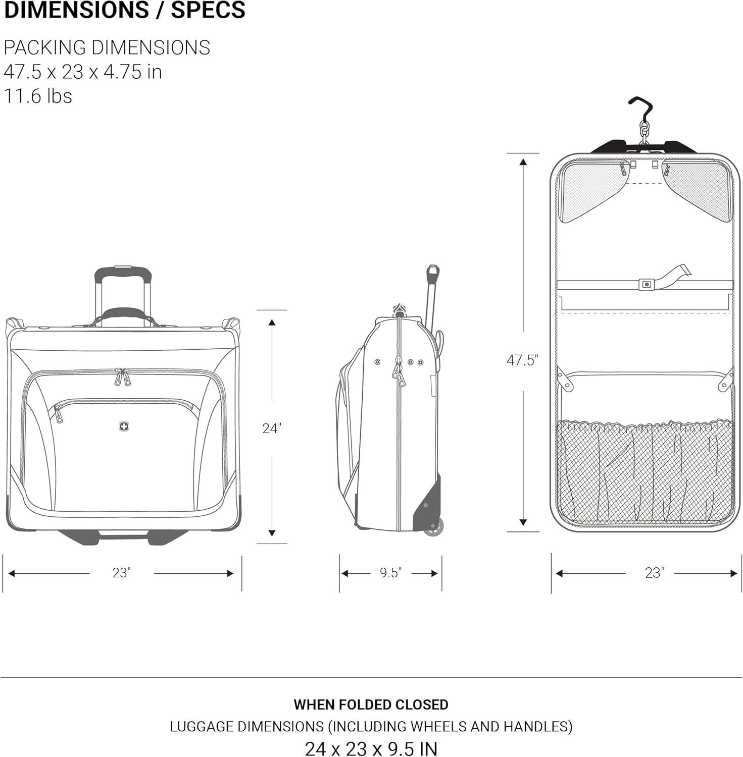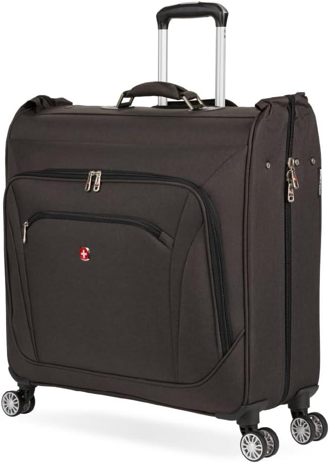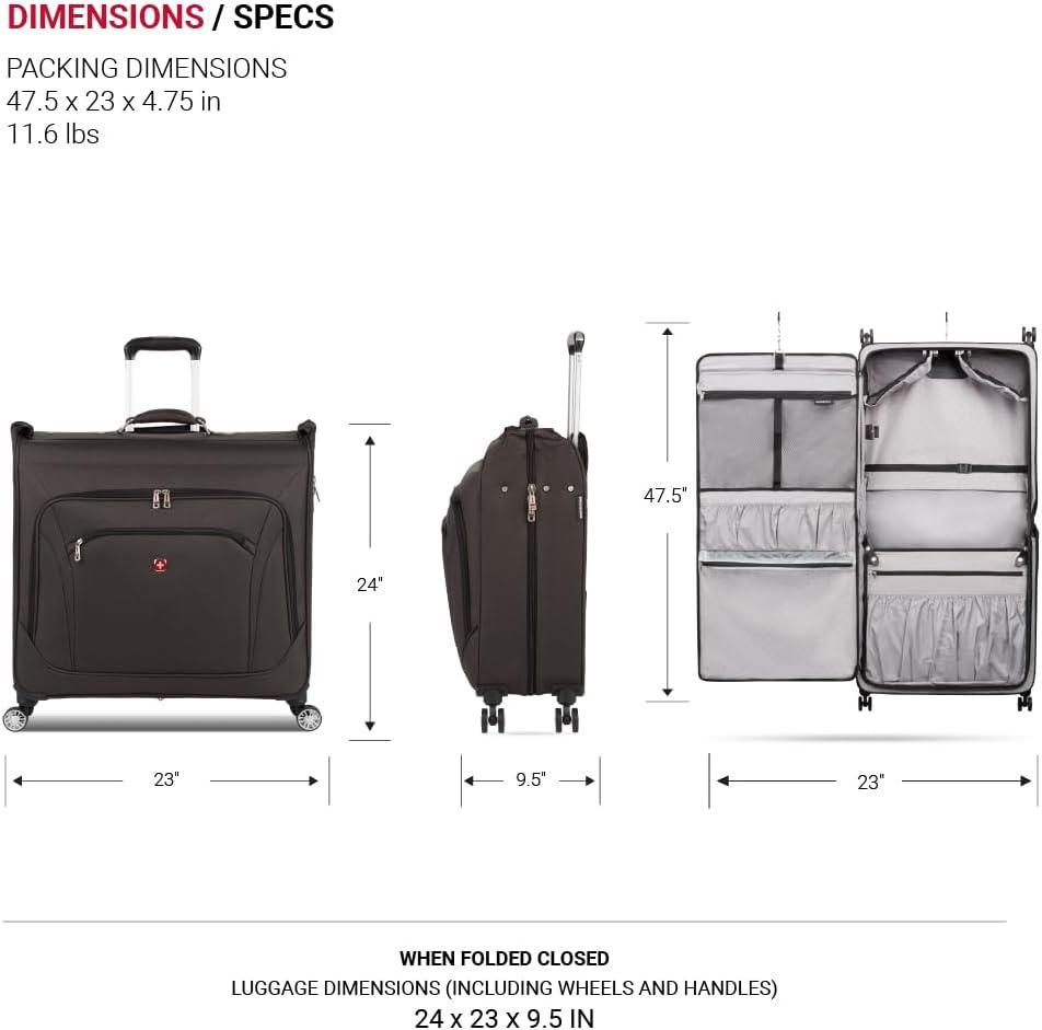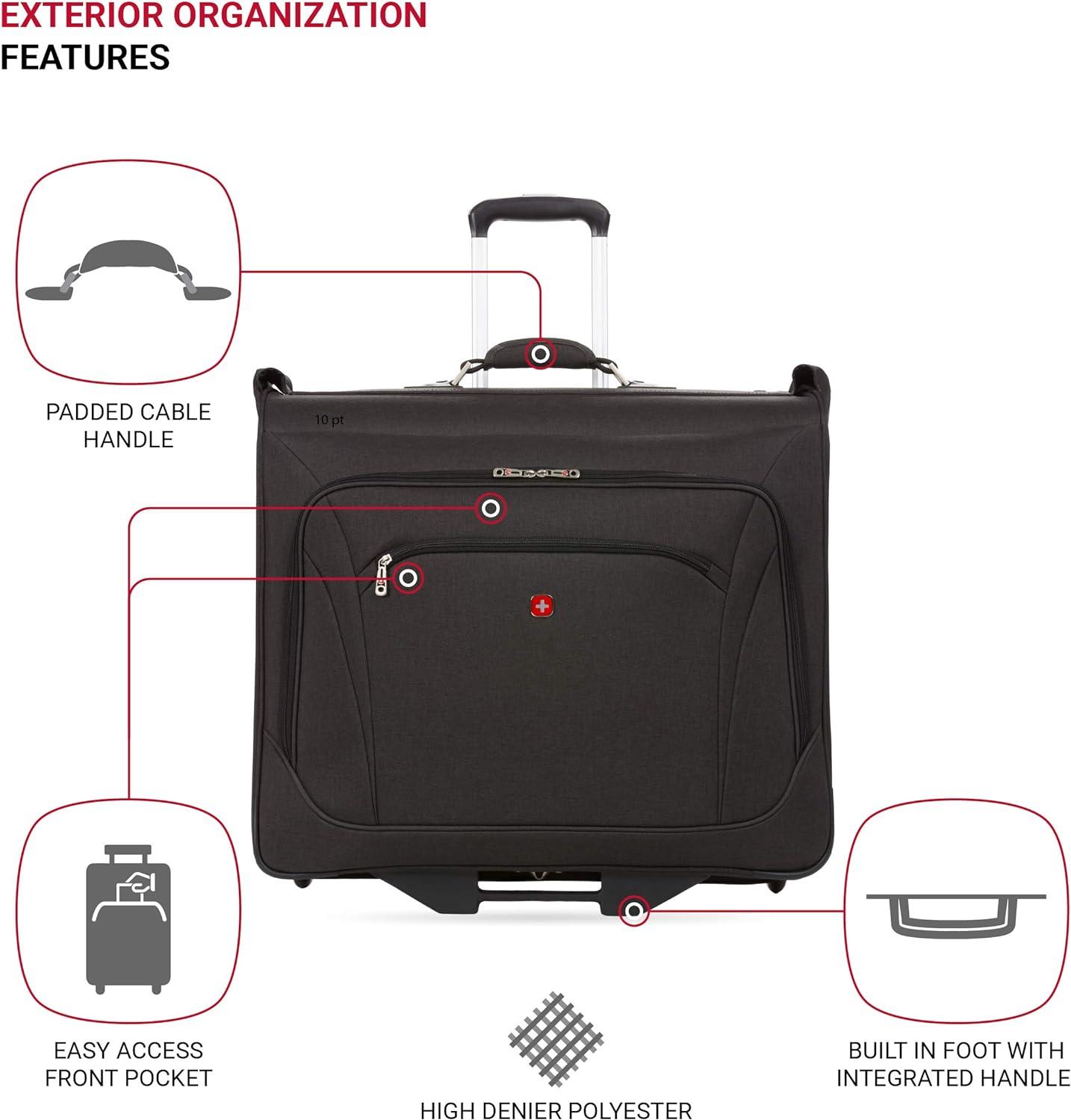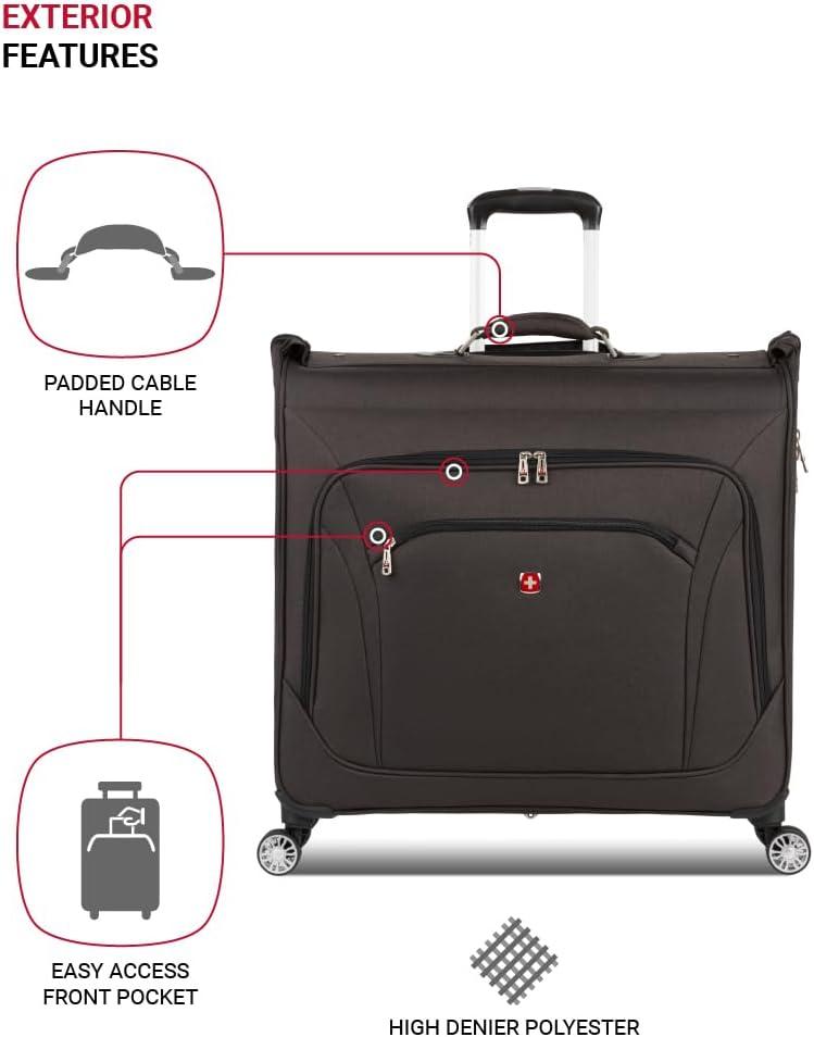 FULL FEATURED GARMENT BAG: This SwissGear Wheeled Garment bag opens into four separate compartments with tie-down straps and various pockets to store clothes and shoes.