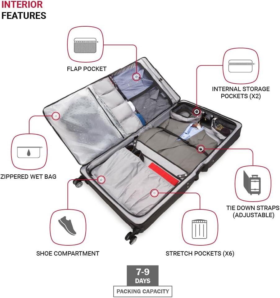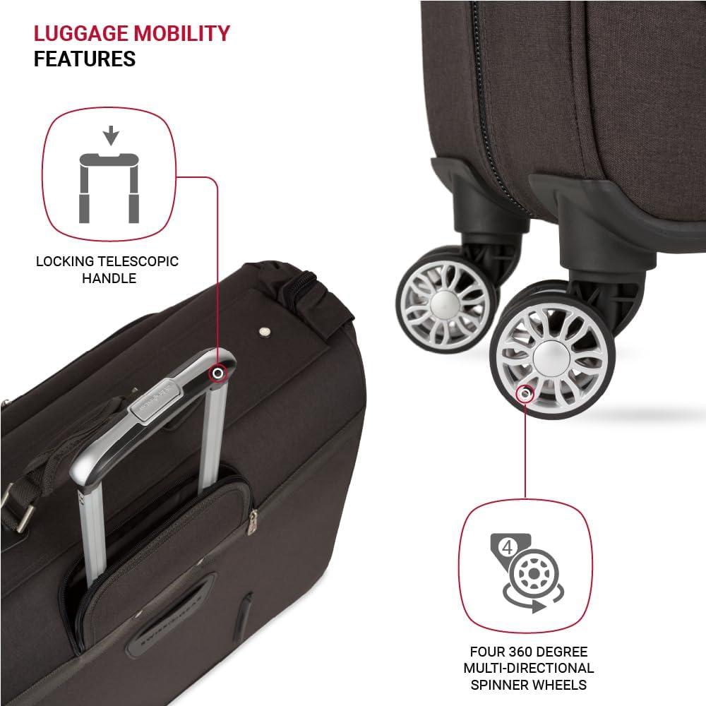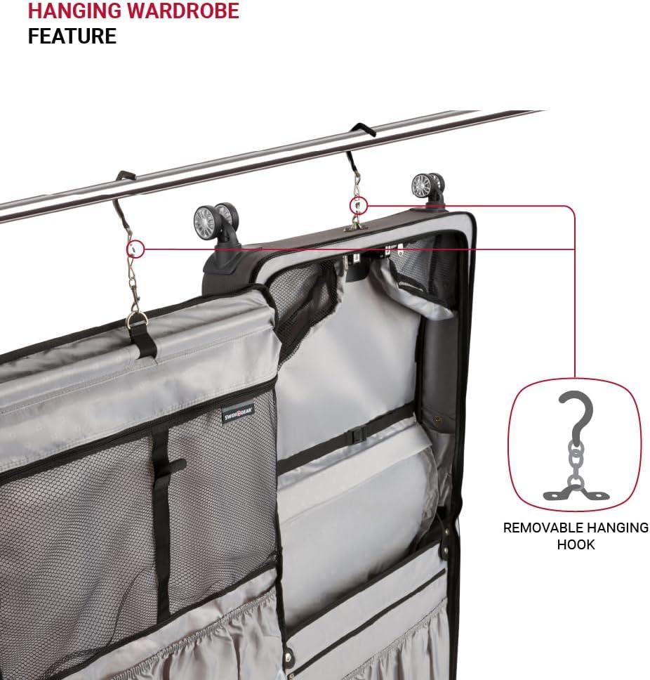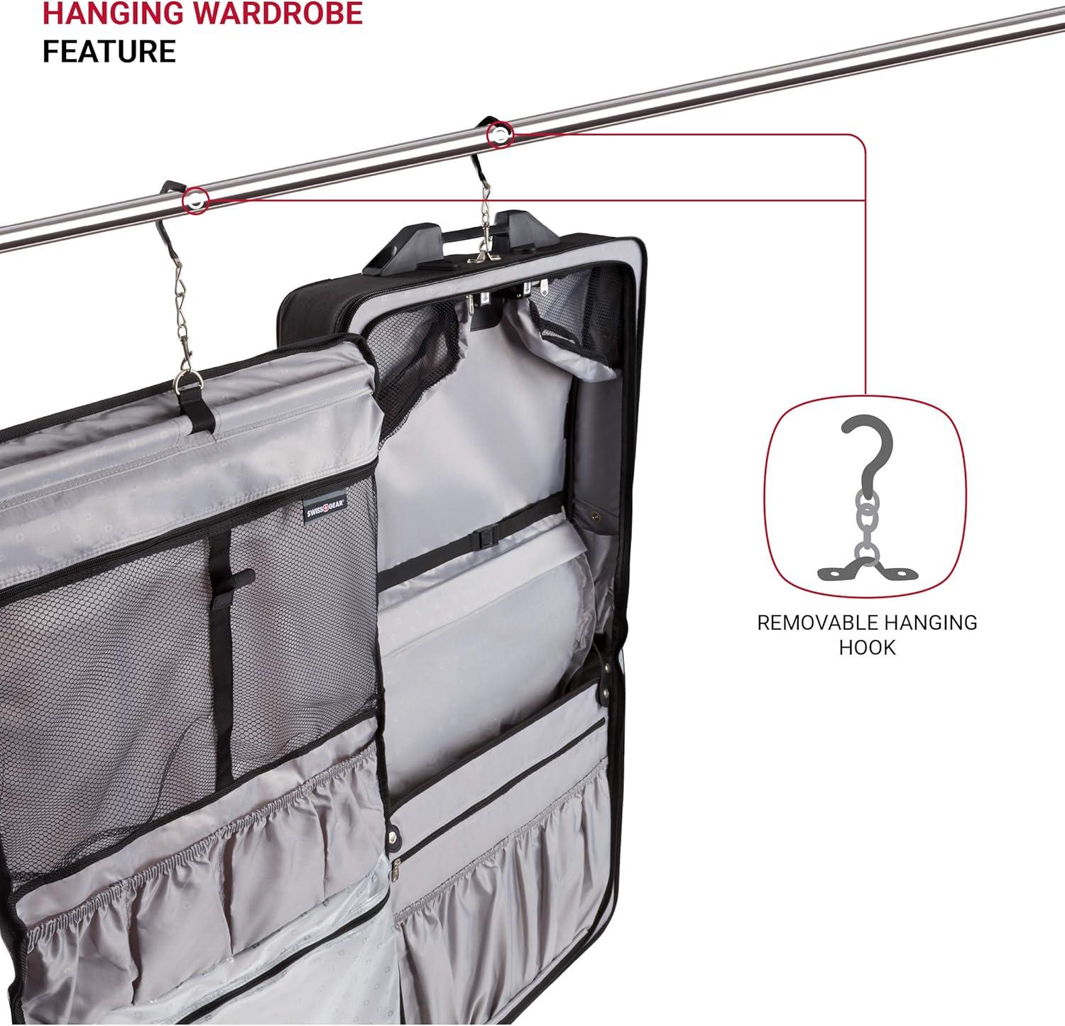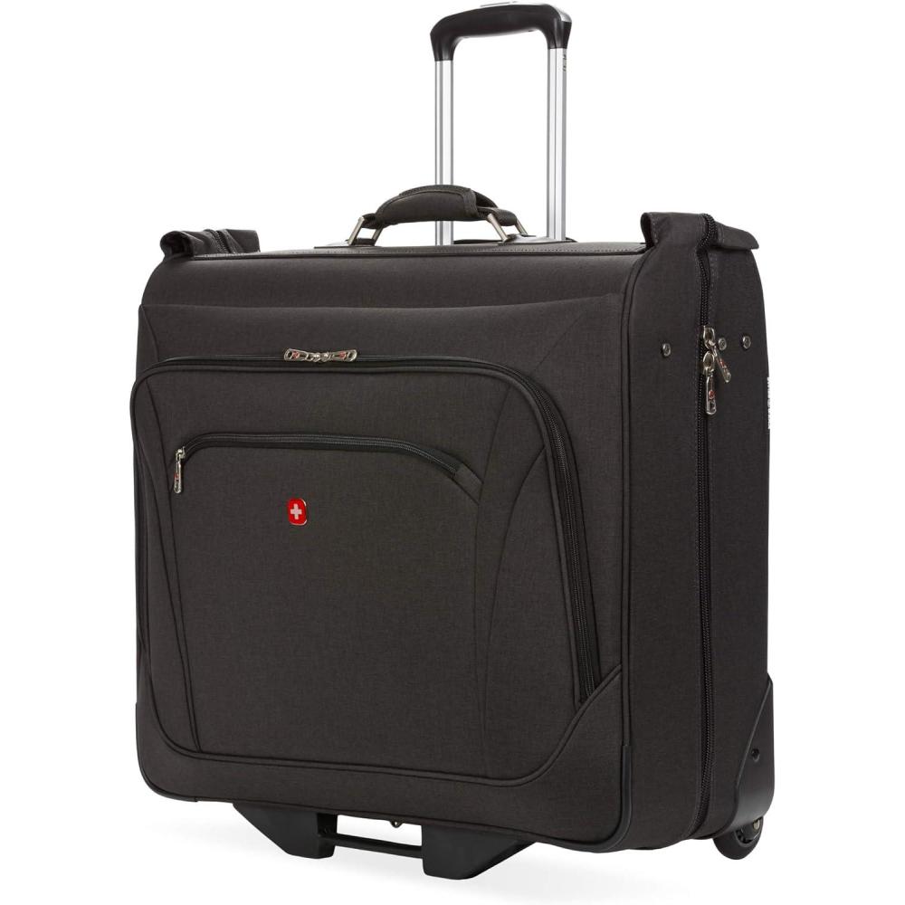 FULL FEATURED GARMENT BAG: This SwissGear Wheeled Garment bag opens into four separate compartments with tie-down straps and various pockets to store clothes and shoes.