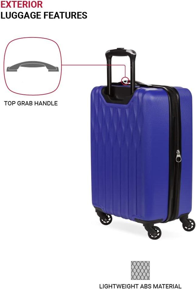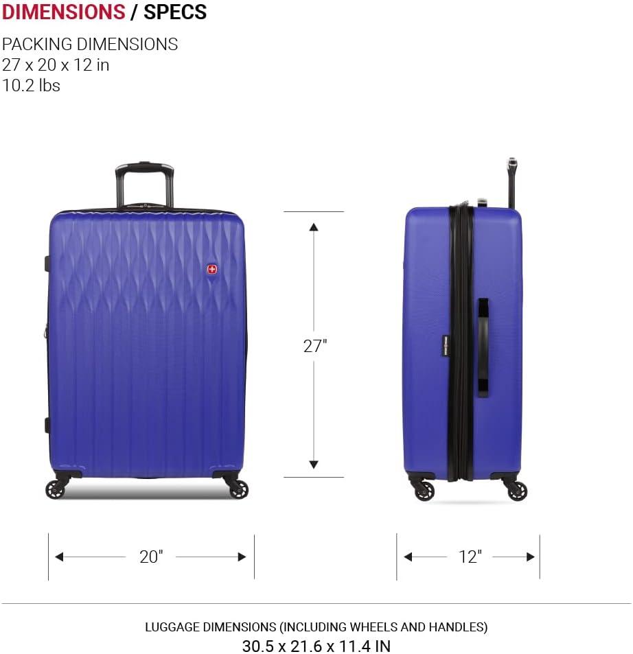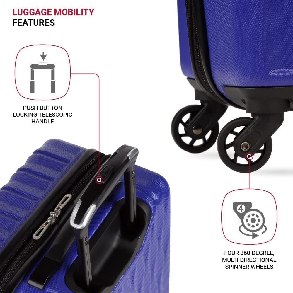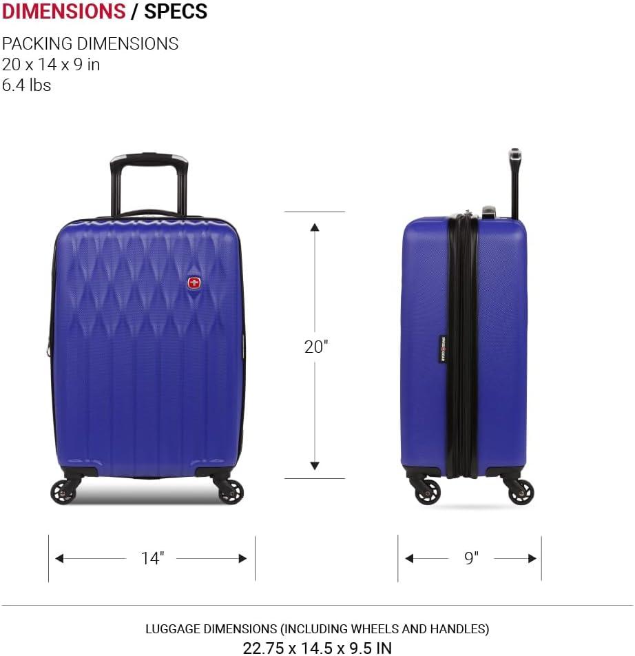 SwissGear 8018 Hardside Expandable Luggage with Spinner Wheels is the perfect carry-on luggage for your next trip. This 20-inch suitcase is made of durable ABS and includes co-molded lift handle(s) with soft rubber hand grips for easy maneuverability. The split-case design expands 2″ for additional packing space and a variety of internal pockets keep you organized. The eight 360-degree multi-directional spinner wheels and a premium, push-button steel locking telescopic handle make it easy to navigate through the airport. With outside dimensions of 22.75 x 15 x 9.5 inches including wheels and handles, this suitcase offers 20 x 14 x 9 inches of packing space. This hardside luggage is perfect for those who need a lightweight and durable suitcase for their travels. The hardshell exterior is designed to protect your belongings from the wear and tear of travel, while the spinner wheels make it easy to move around. The telescopic handle is designed to be comfortable and easy to use, and the internal pockets help you stay organized. Plus, this suitcase comes with a 10 year warranty against defects in materials and workmanship.