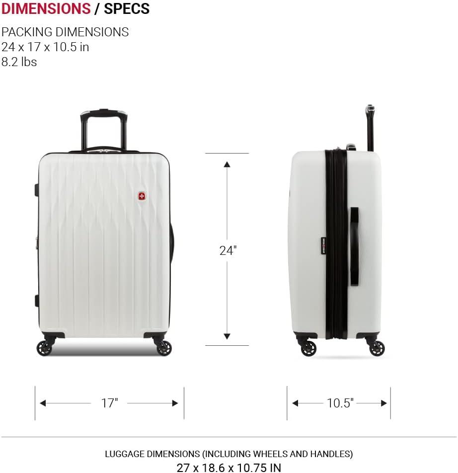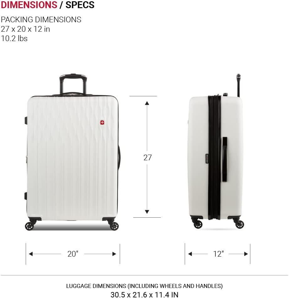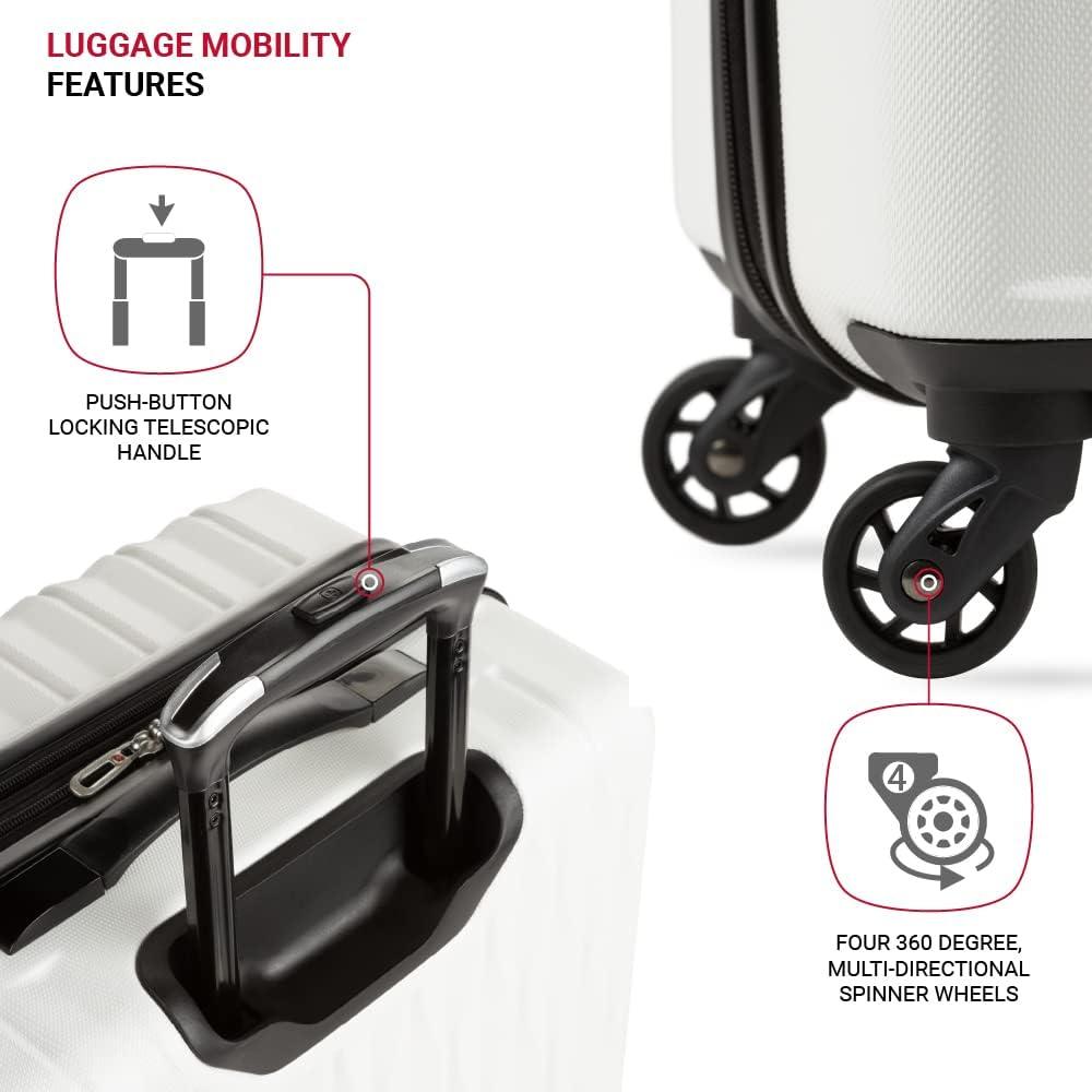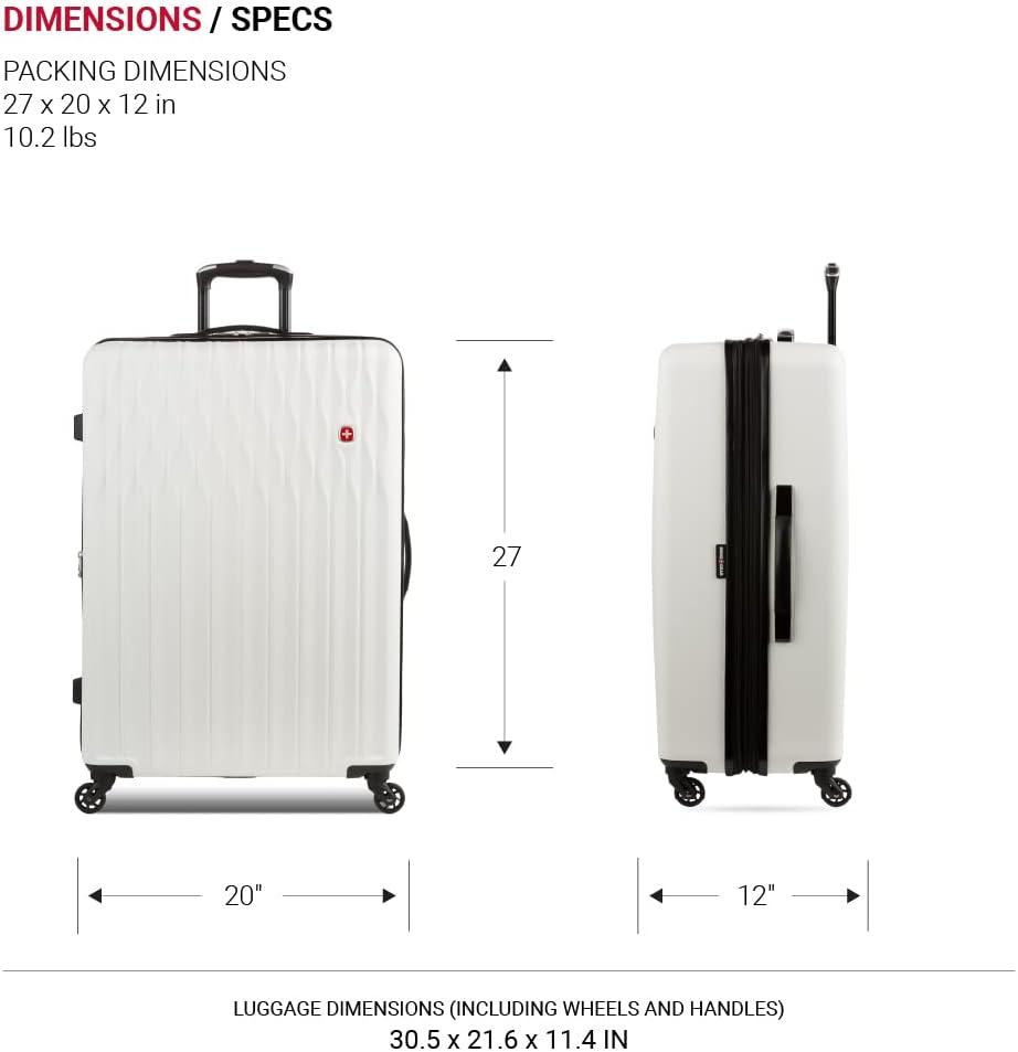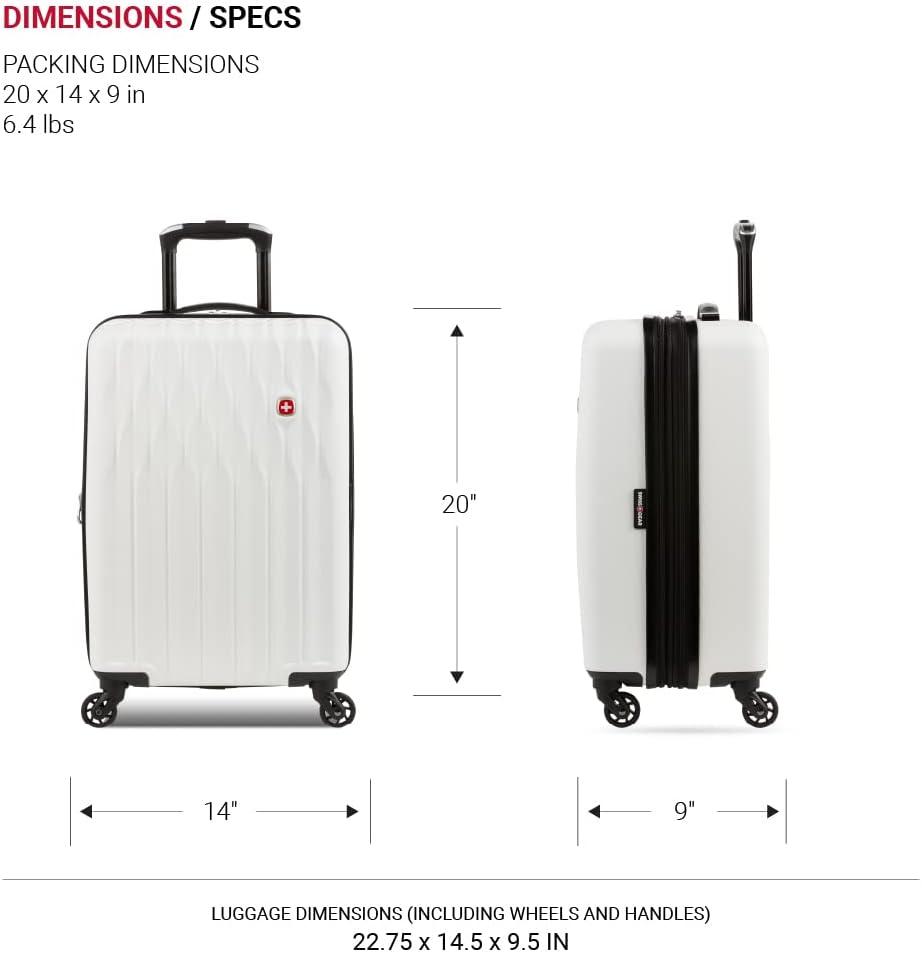 SwissGear 8018 Hardside Expandable Luggage with Spinner Wheels is the perfect carry-on luggage for your next trip. This 20-inch suitcase is made of durable ABS and includes co-molded lift handle(s) with soft rubber hand grips for easy maneuverability. The split-case design expands 2″ for additional packing space and a variety of internal pockets keep you organized. The eight 360-degree multi-directional spinner wheels and a premium, push-button steel locking telescopic handle make it easy to navigate through the airport. With outside dimensions of 22.75 x 15 x 9.5 inches including wheels and handles, this suitcase offers 20 x 14 x 9 inches of packing space. This hardside luggage is perfect for those who need a lightweight and durable suitcase for their travels. The hardshell exterior is designed to protect your belongings from the wear and tear of travel, while the spinner wheels make it easy to move around. The telescopic handle is designed to be comfortable and easy to use, and the internal pockets help you stay organized. Plus, this suitcase comes with a 10 year warranty against defects in materials and workmanship.