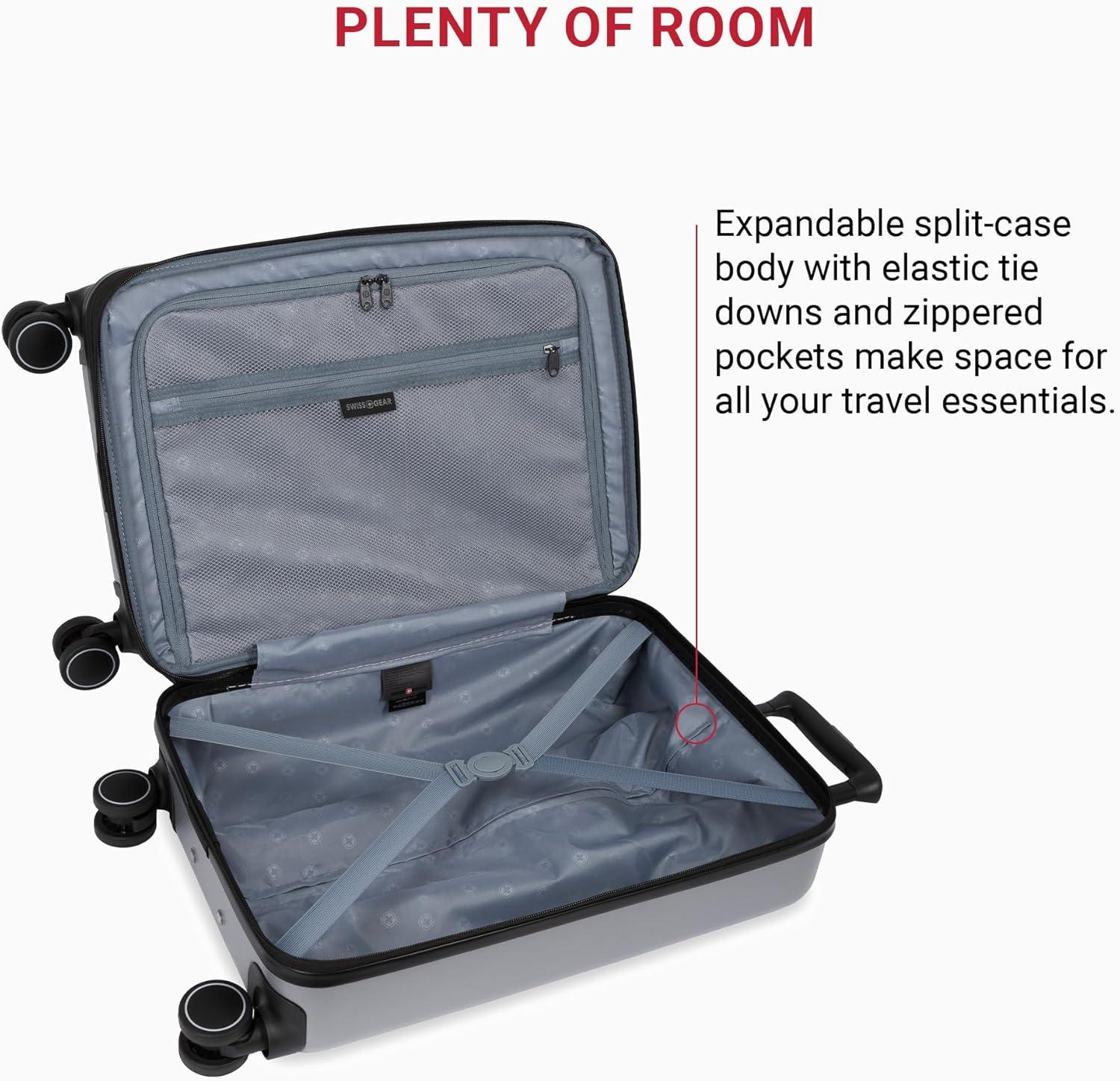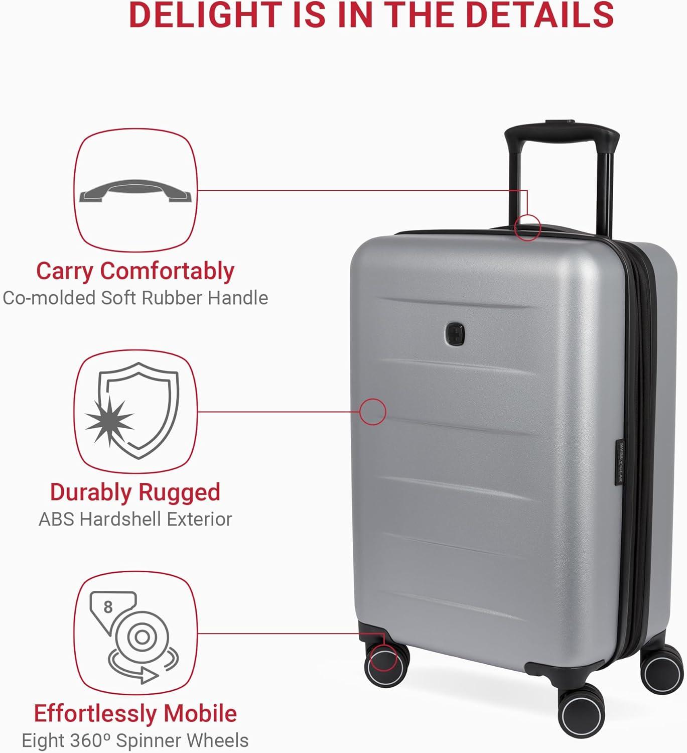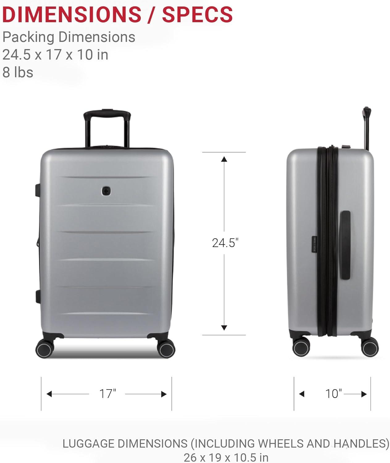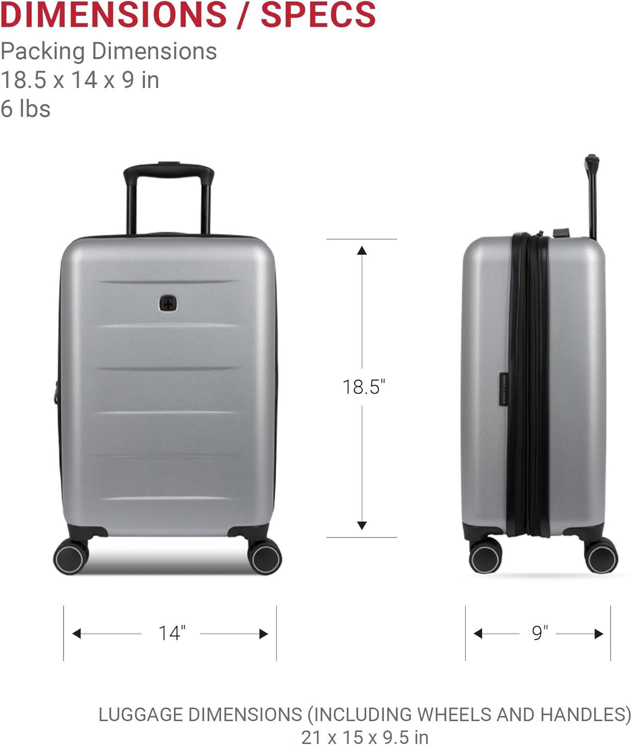 SwissGear 8020 Hardside Expandable Luggage with Spinner Wheels is the perfect carry-on luggage for your next trip. This 18-inch suitcase is made of durable ABS and includes co-molded lift handle(s) with soft rubber hand grips for easy maneuverability. The split-case design expands 2″ for additional packing space and a variety of internal pockets keep you organized. The eight 360-degree multi-directional spinner wheels and a premium, push-button steel locking telescopic handle make it easy to navigate through the airport. With outside dimensions of 21.5 x 15 x 9.5 inches including wheels and handles, this suitcase offers 18.5 x 14 x 9 inches of packing space. This hardside luggage is perfect for those who need a lightweight and durable suitcase for their travels. The hardshell exterior is designed to protect your belongings from the wear and tear of travel, while the spinner wheels and telescopic handle make it easy to move around. Plus, this suitcase comes with a 10 year warranty against defects in materials and workmanship.