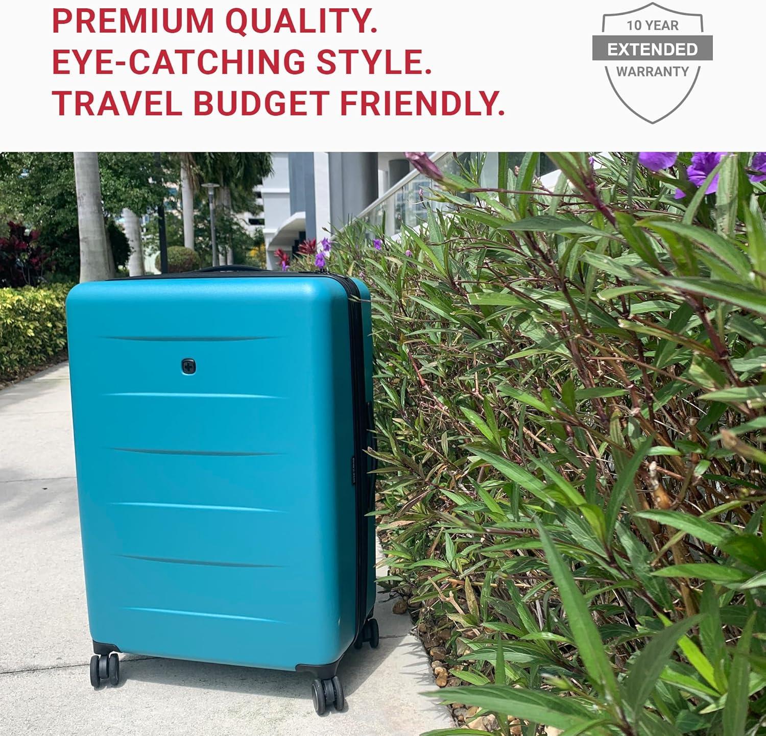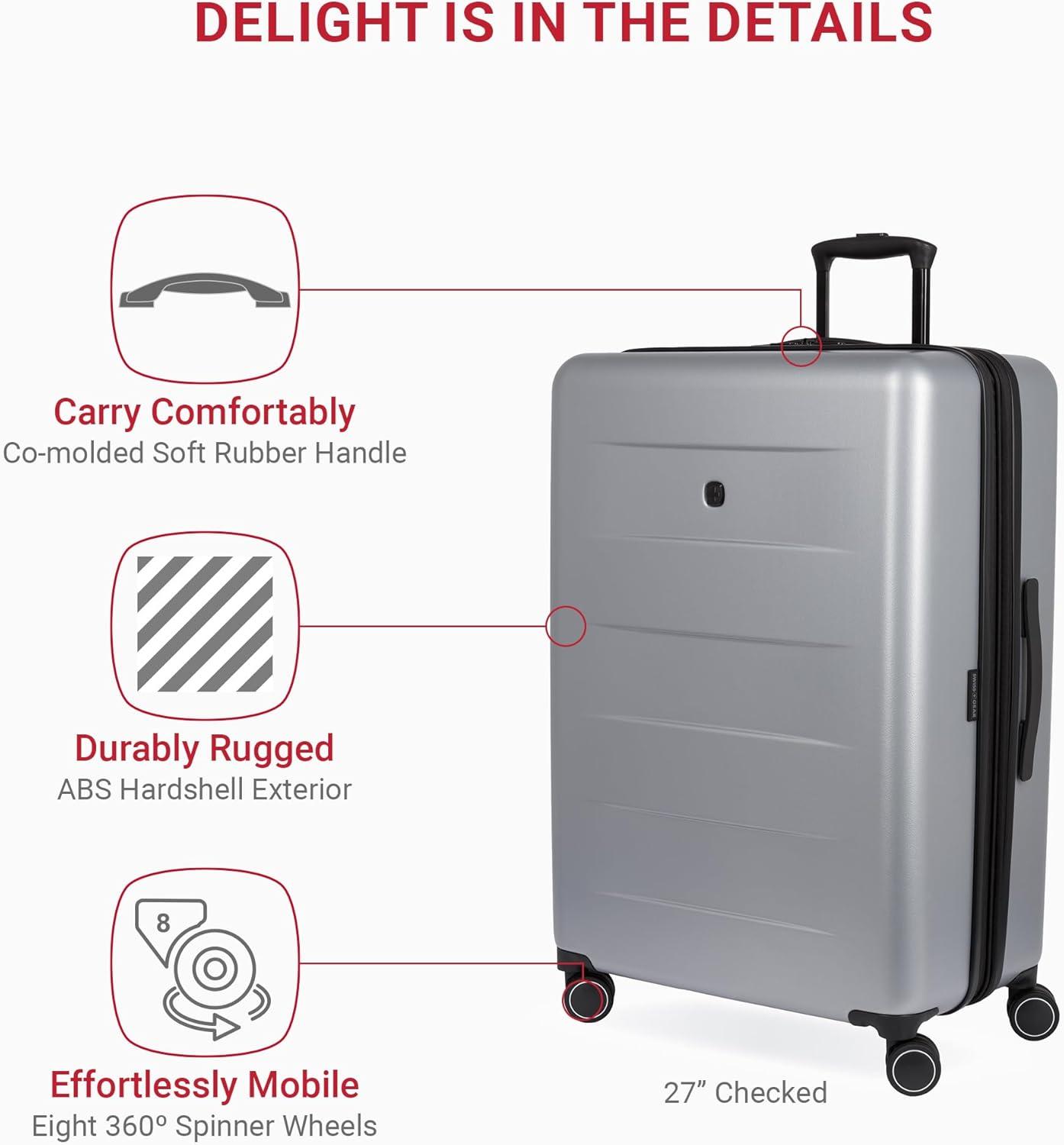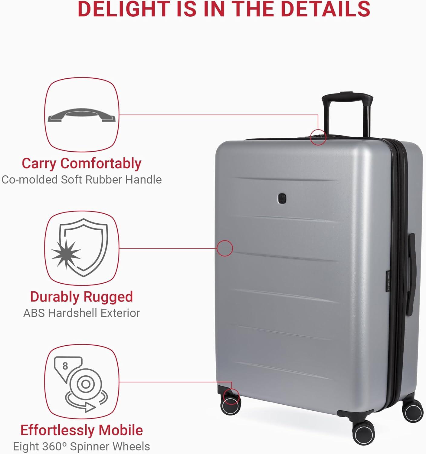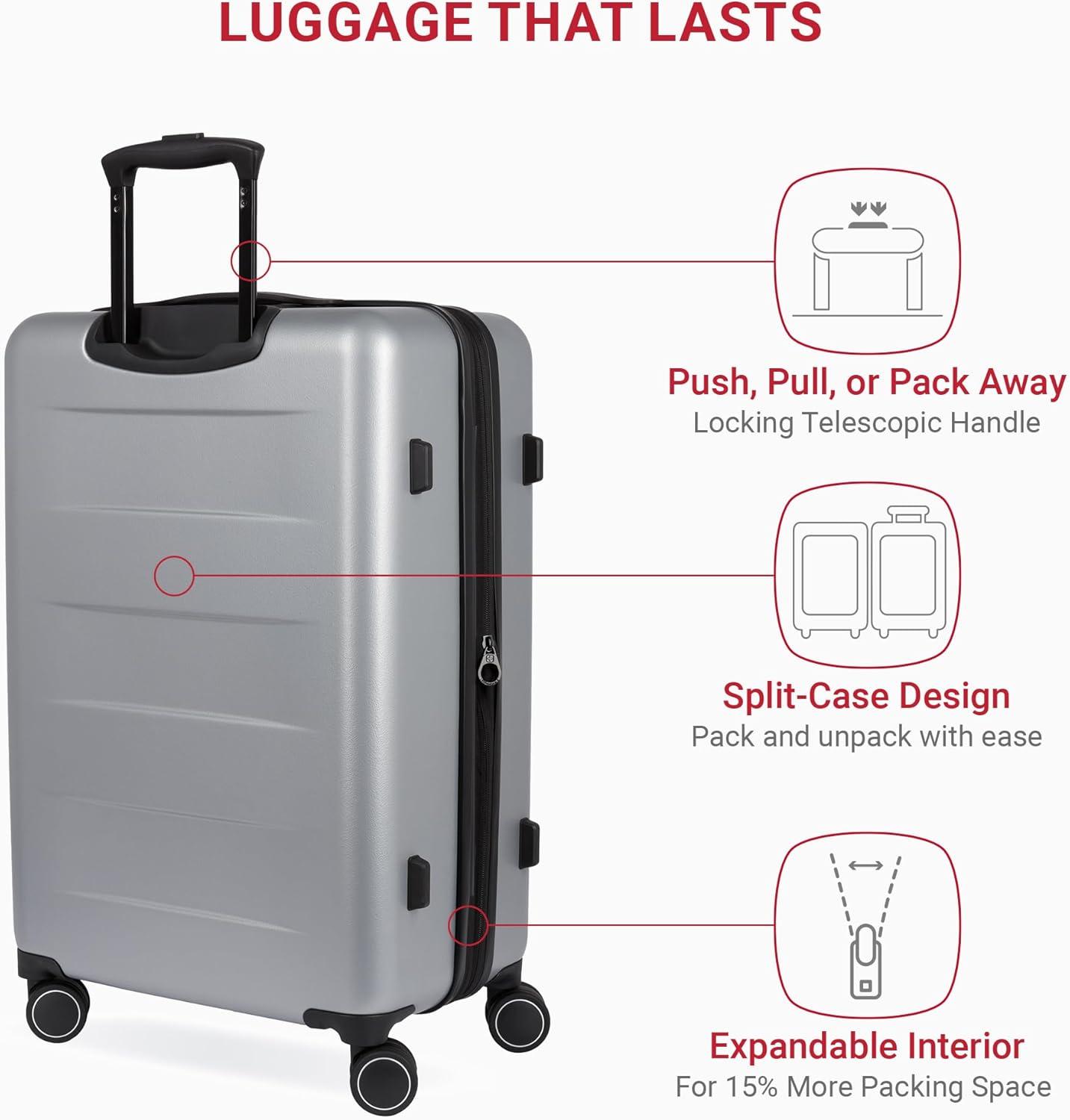 SwissGear 8020 Hardside Expandable Luggage with Spinner Wheels is the perfect carry-on luggage for your next trip. This 18-inch suitcase is made of durable ABS and includes co-molded lift handle(s) with soft rubber hand grips for easy maneuverability. The split-case design expands 2″ for additional packing space and a variety of internal pockets keep you organized. The eight 360-degree multi-directional spinner wheels and a premium, push-button steel locking telescopic handle make it easy to navigate through the airport. With outside dimensions of 21.5 x 15 x 9.5 inches including wheels and handles, this suitcase offers 18.5 x 14 x 9 inches of packing space. This hardside luggage is perfect for those who need a lightweight and durable suitcase for their travels. The hardshell exterior is designed to protect your belongings from the wear and tear of travel, while the spinner wheels and telescopic handle make it easy to move around. Plus, this suitcase comes with a 10 year warranty against defects in materials and workmanship.
