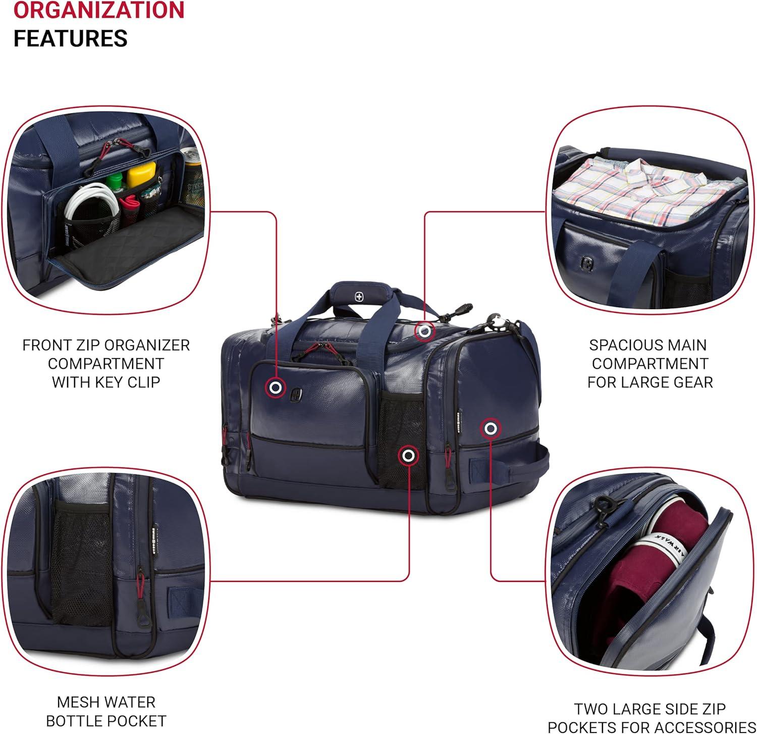 Are you looking for a reliable and spacious travel or workout bag? Look no further than the SwissGear Apex travel and gym bag for women and men. The perfect travel duffel bag for women and men, this rugged workout / weekend bag is made of durable, abrasion-resistant polyester made to withstand heavy use and harsh conditions. An ideal overnight bag for women and men, this packable duffle bag features a zipper closure and a large main compartment, 2 end pockets, and a front organizer pocket for storing writing utensils, snacks, and keys. Plus, it has a stretch mesh water bottle pocket to help you remain hydrated. The top bungee-cord storage system is perfect for quickly storing items, such as a light jacket or an umbrella. You can also lift and maneuver this workout / weekender bag for women and men using the reinforced top and side handles, or throw it over your shoulder with the removable, adjustable shoulder strap to enjoy hands-free mobility. The SwissGear Apex Travel Duffle Bag is the perfect solution for your travel needs. With this carry-on duffel bag, you can travel with convenience.