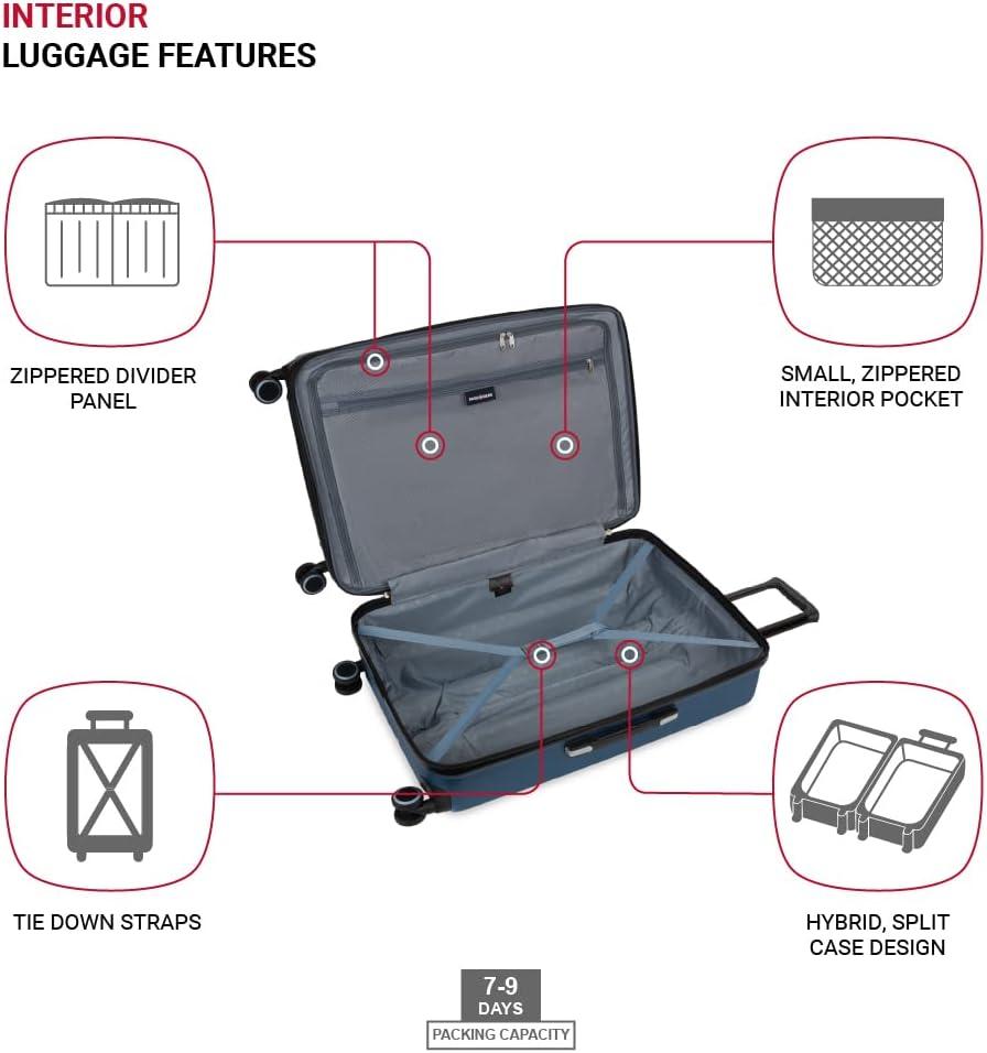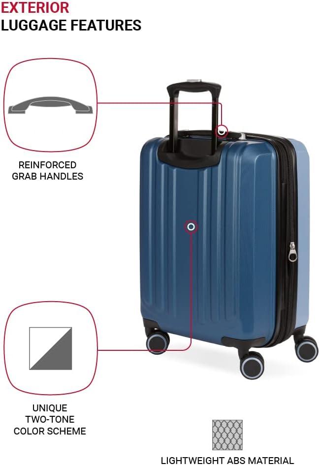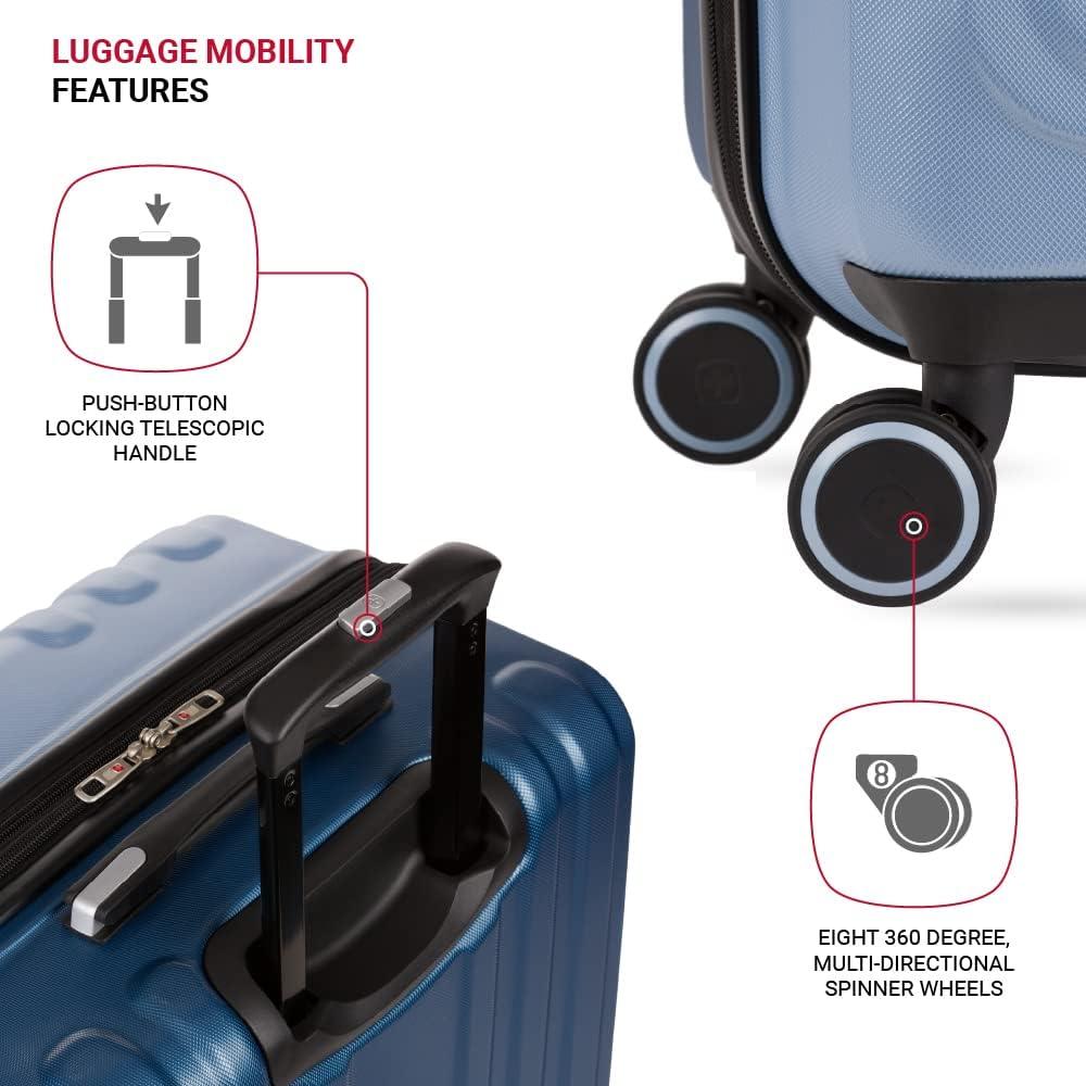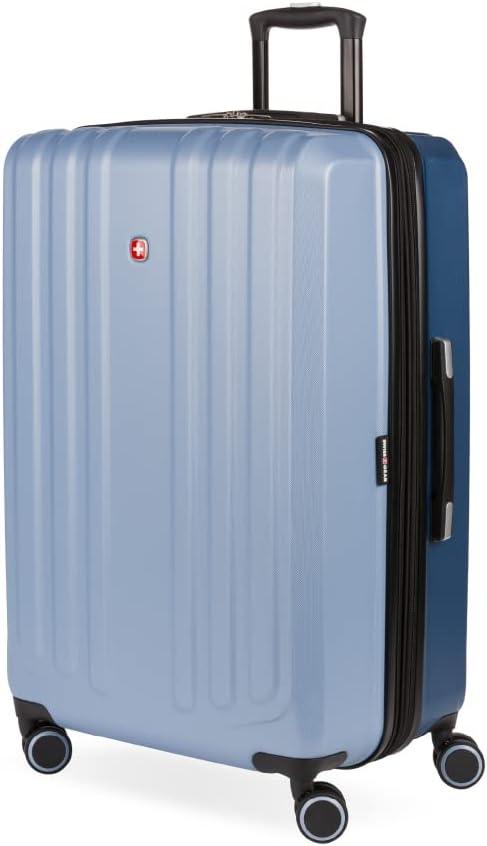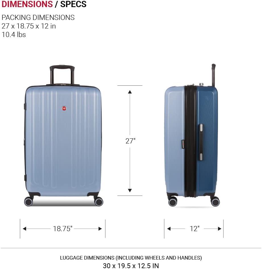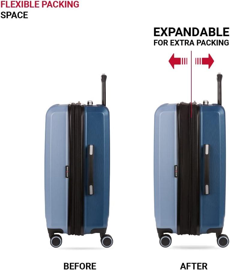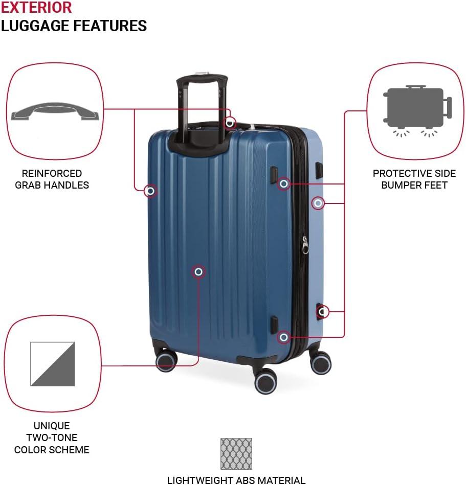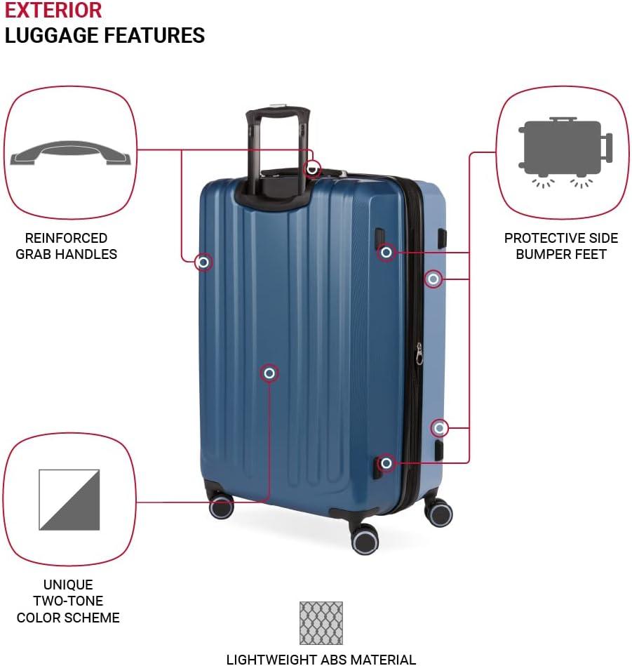 Traveling doesn't have to be a hassle thanks to SwissGear's 8028 Expandable Hard Shell Luggage with Spinner Wheels. Perfect for any trip, this 3-piece hard suitcase set includes an 19″ expandable carry-on suitcase, a 24″ medium suitcase, and a 28″ large suitcase. The durable ABS construction includes co-molded lift handle(s) with soft rubber hand grips, making it both stylish and reliable. 8 360-degree multi-directional spinner wheels and a premium, push-button steel locking telescopic handle make it easy to maneuver the entire set. Each hardshell suitcase features a split-case design that expands 2″ for additional packing space, plus a variety of internal pockets that keep you organized. SwissGear products, including our hardshell luggage sets, are tested to ensure our products meet stringent standards. This hard shell suitcase set comes with a 10-year warranty against defects in materials and workmanship.