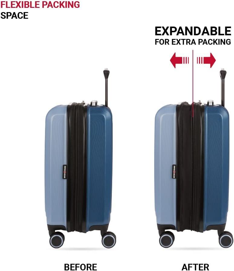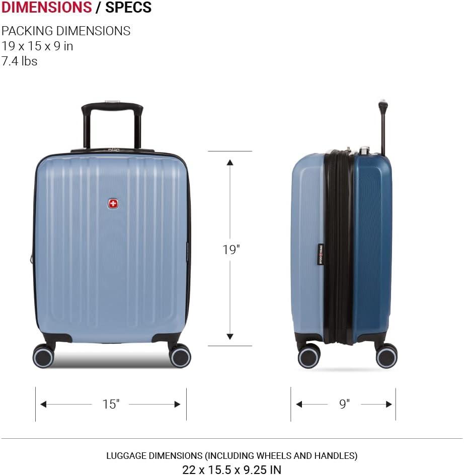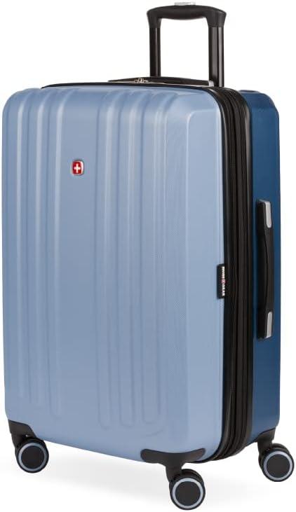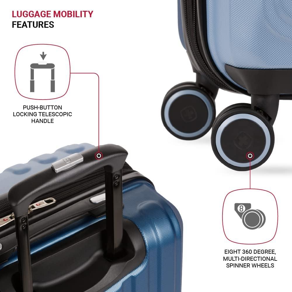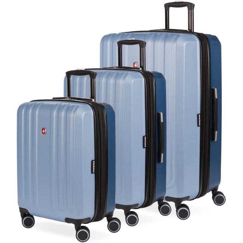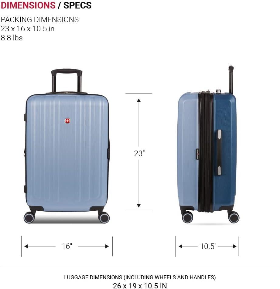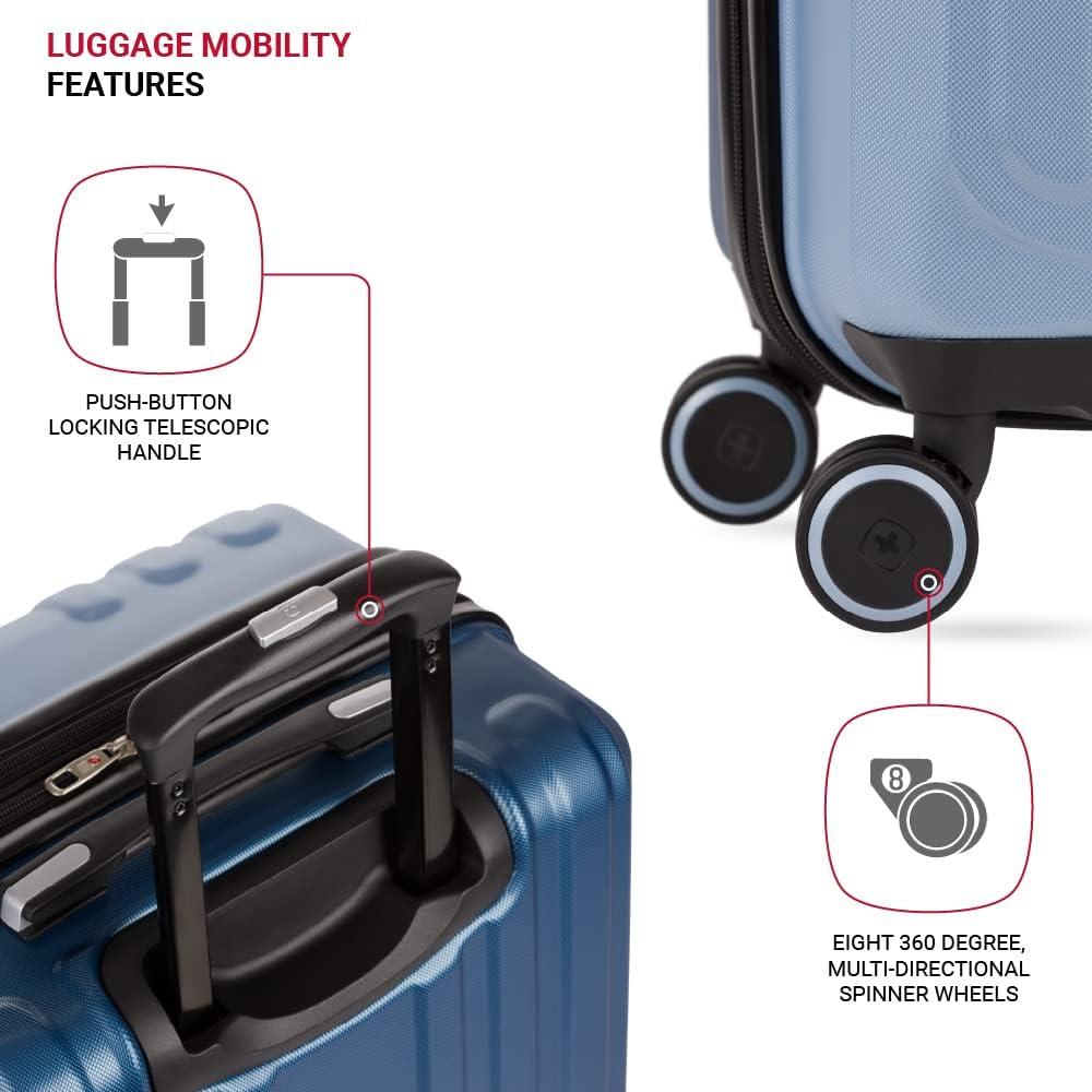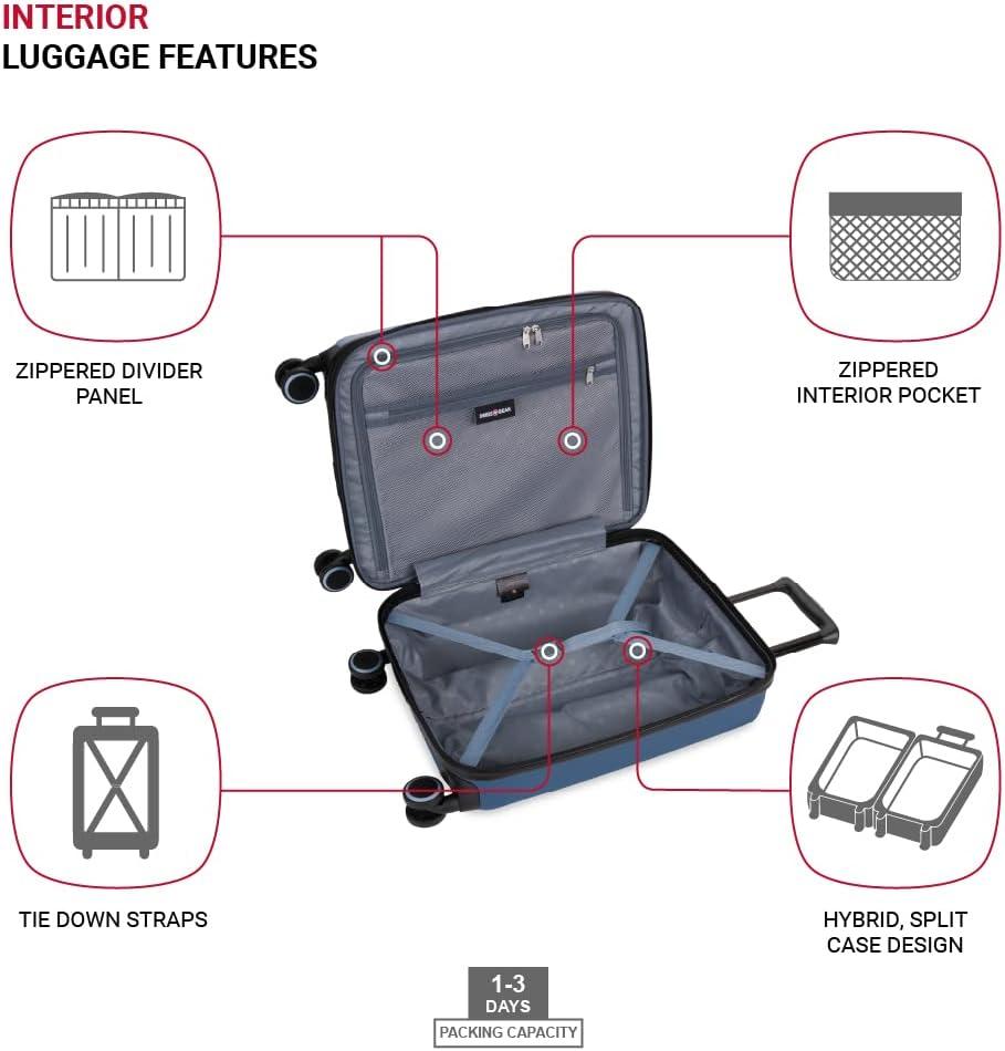 Traveling doesn't have to be a hassle thanks to SwissGear's 8028 Expandable Hard Shell Luggage with Spinner Wheels. Perfect for any trip, this 3-piece hard suitcase set includes an 19″ expandable carry-on suitcase, a 24″ medium suitcase, and a 28″ large suitcase. The durable ABS construction includes co-molded lift handle(s) with soft rubber hand grips, making it both stylish and reliable. 8 360-degree multi-directional spinner wheels and a premium, push-button steel locking telescopic handle make it easy to maneuver the entire set. Each hardshell suitcase features a split-case design that expands 2″ for additional packing space, plus a variety of internal pockets that keep you organized. SwissGear products, including our hardshell luggage sets, are tested to ensure our products meet stringent standards. This hard shell suitcase set comes with a 10-year warranty against defects in materials and workmanship.