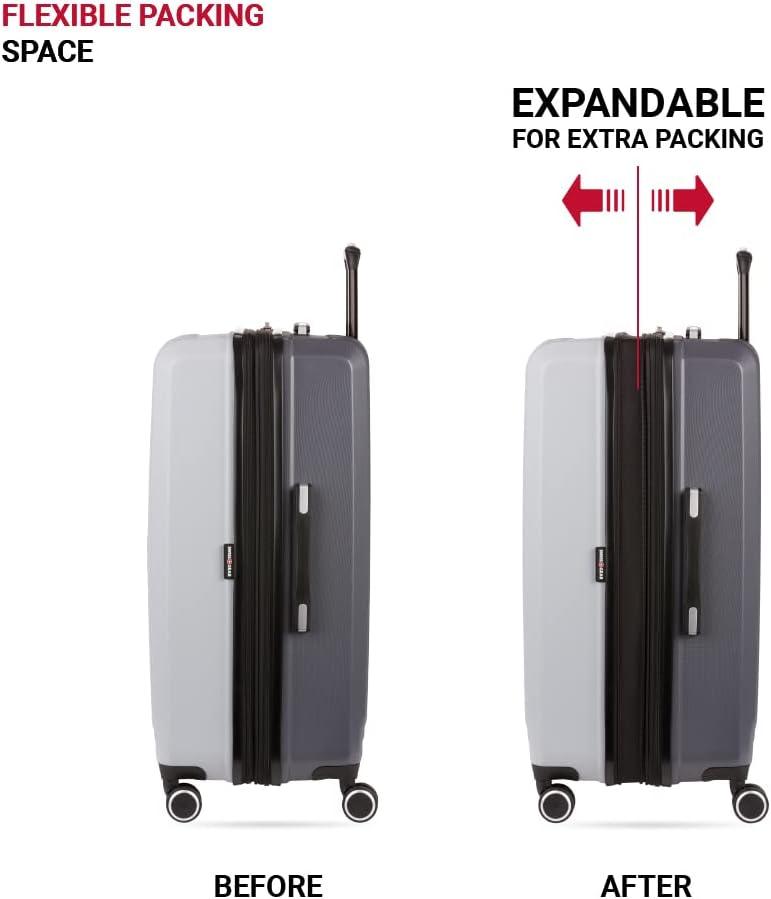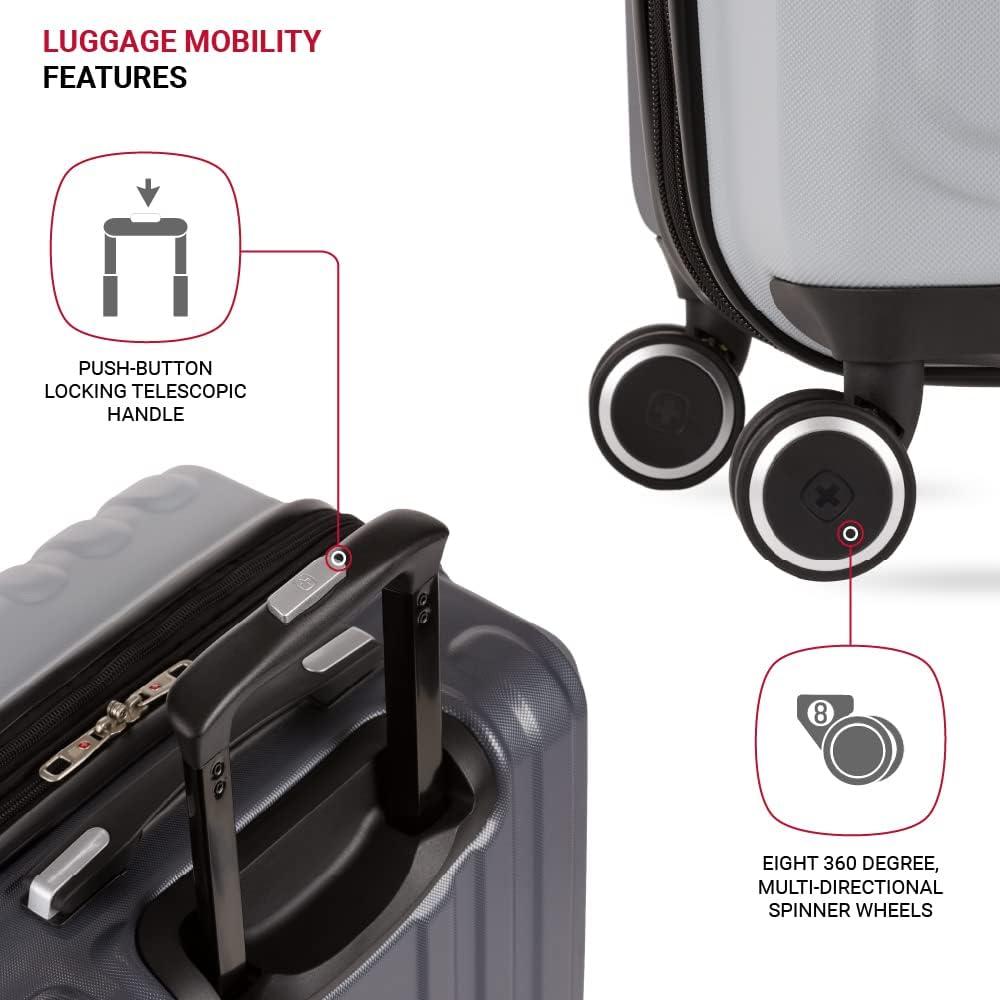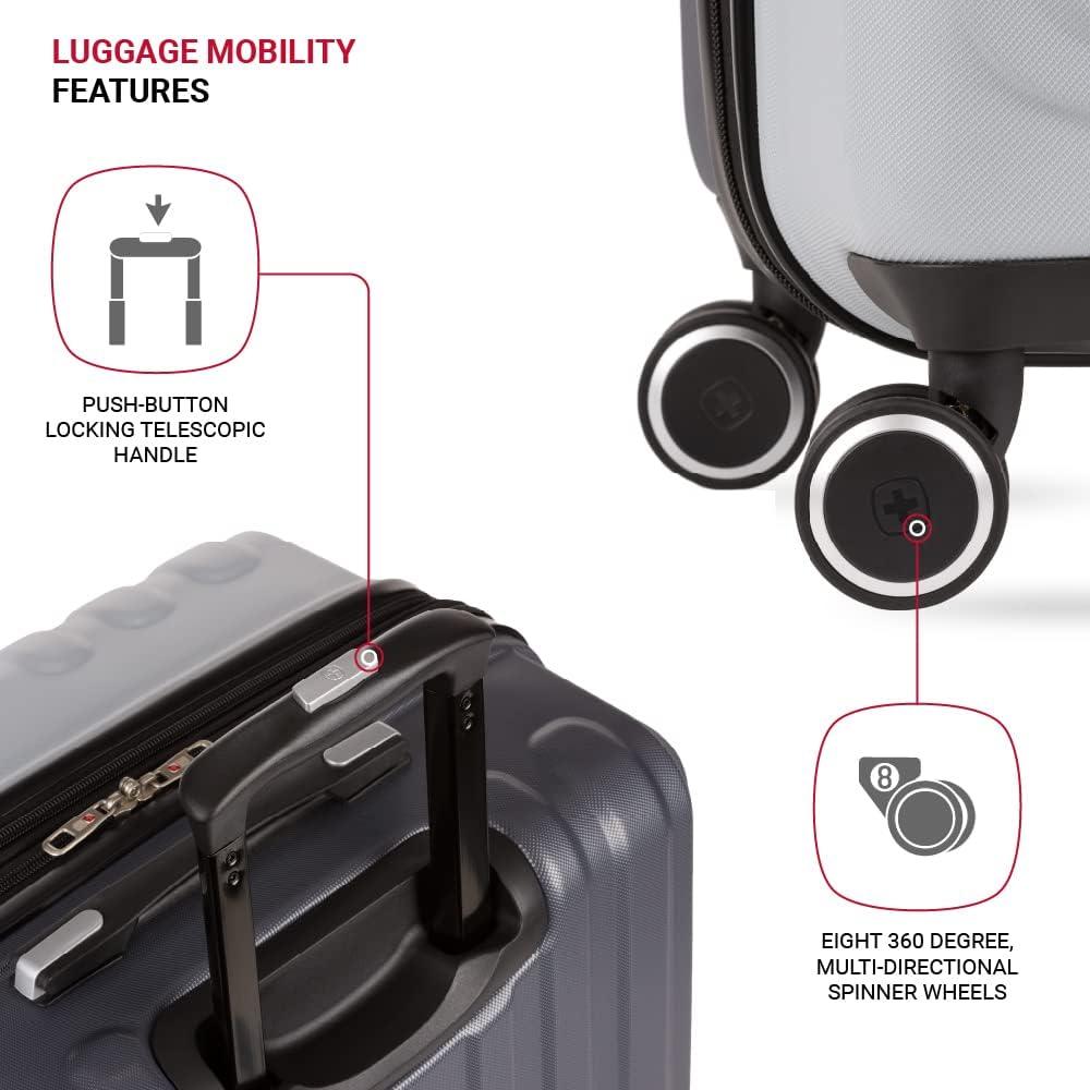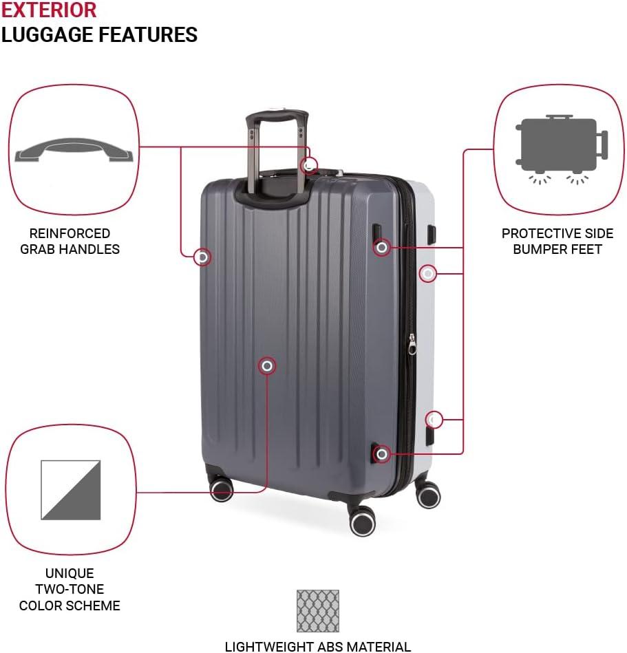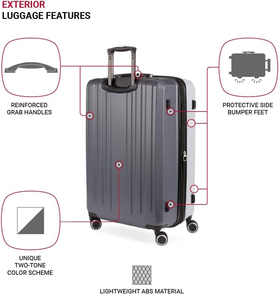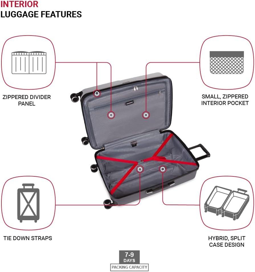 Traveling doesn't have to be a hassle thanks to SwissGear's 8028 Expandable Hard Shell Luggage with Spinner Wheels. Perfect for any trip, this 3-piece hard suitcase set includes an 19″ expandable carry-on suitcase, a 24″ medium suitcase, and a 28″ large suitcase. The durable ABS construction includes co-molded lift handle(s) with soft rubber hand grips, making it both stylish and reliable. 8 360-degree multi-directional spinner wheels and a premium, push-button steel locking telescopic handle make it easy to maneuver the entire set. Each hardshell suitcase features a split-case design that expands 2″ for additional packing space, plus a variety of internal pockets that keep you organized. SwissGear products, including our hardshell luggage sets, are tested to ensure our products meet stringent standards. This hard shell suitcase set comes with a 10-year warranty against defects in materials and workmanship.