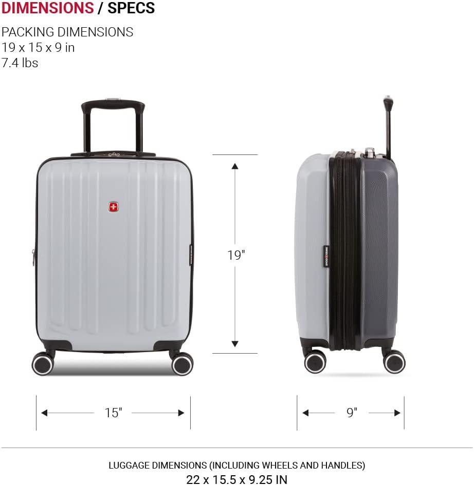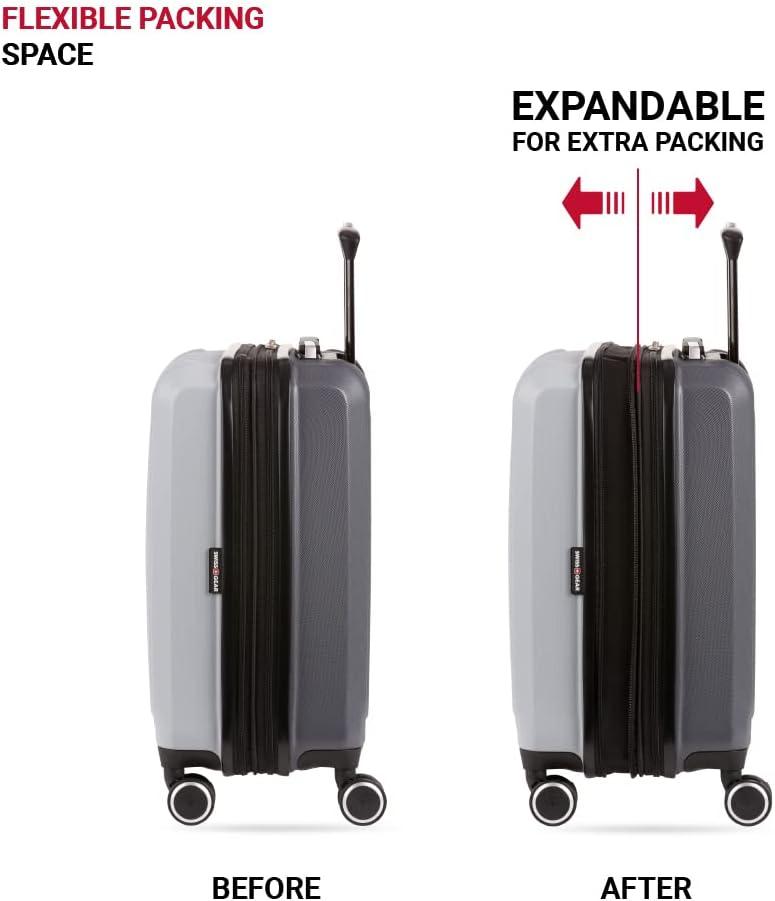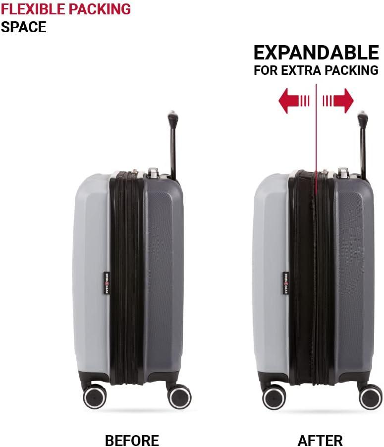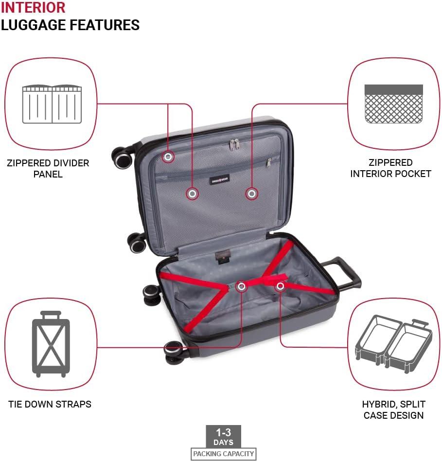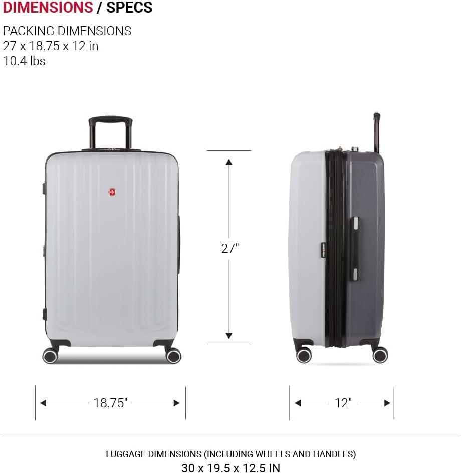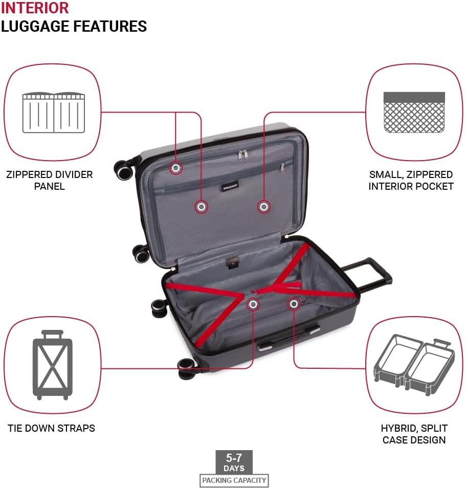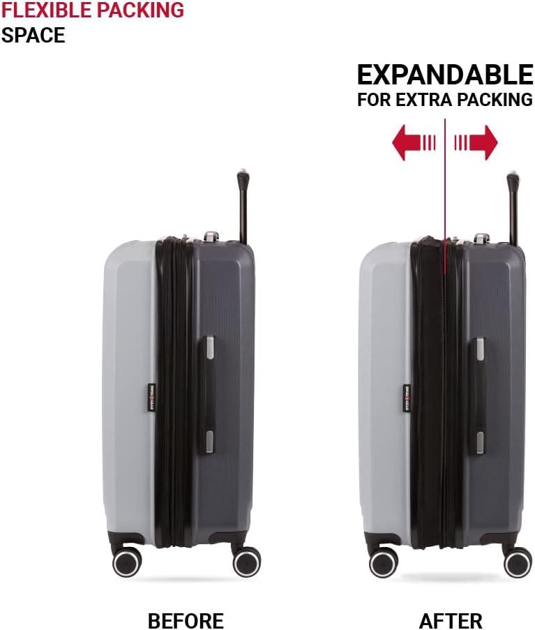 Traveling doesn't have to be a hassle thanks to SwissGear's 8028 Expandable Hard Shell Luggage with Spinner Wheels. Perfect for any trip, this 3-piece hard suitcase set includes an 19″ expandable carry-on suitcase, a 24″ medium suitcase, and a 28″ large suitcase. The durable ABS construction includes co-molded lift handle(s) with soft rubber hand grips, making it both stylish and reliable. 8 360-degree multi-directional spinner wheels and a premium, push-button steel locking telescopic handle make it easy to maneuver the entire set. Each hardshell suitcase features a split-case design that expands 2″ for additional packing space, plus a variety of internal pockets that keep you organized. SwissGear products, including our hardshell luggage sets, are tested to ensure our products meet stringent standards. This hard shell suitcase set comes with a 10-year warranty against defects in materials and workmanship.