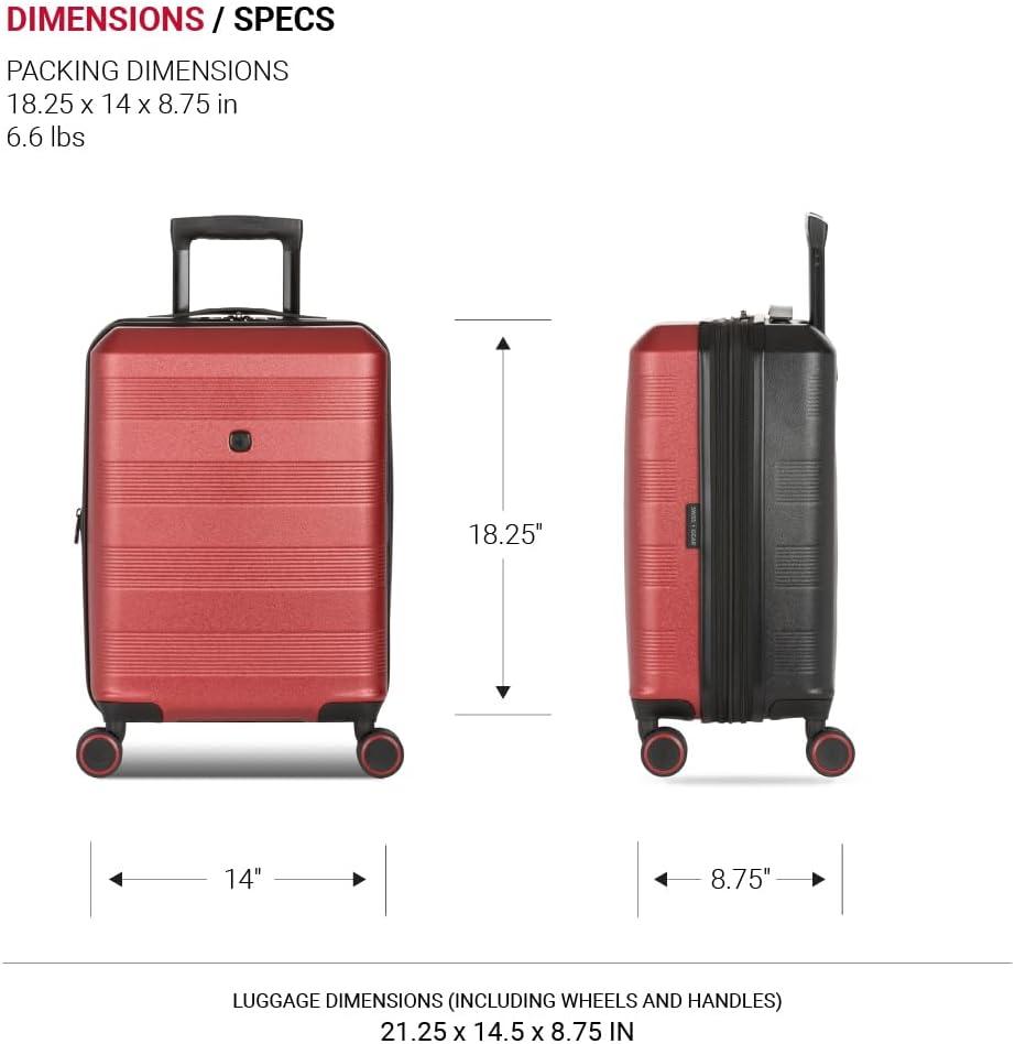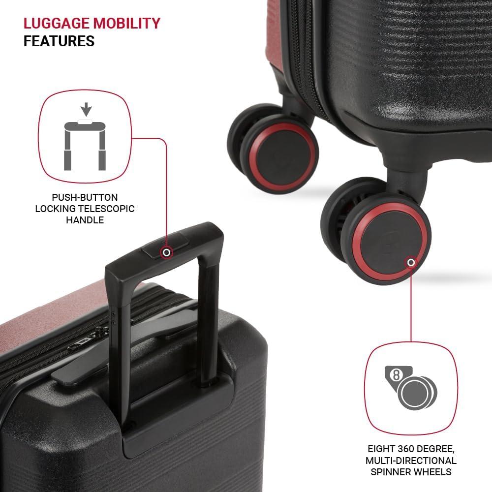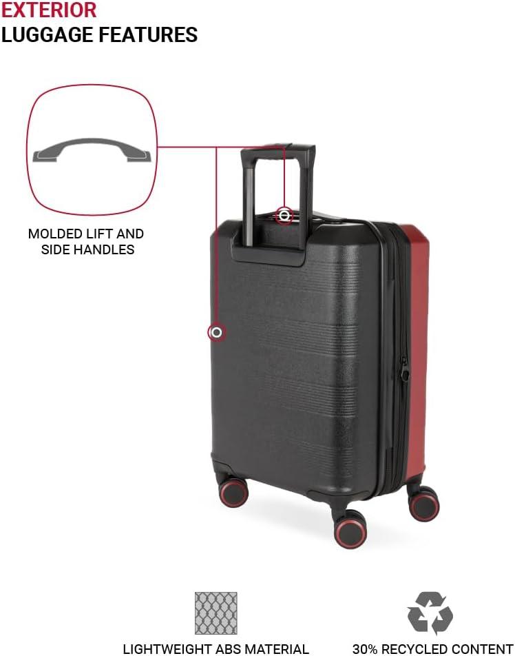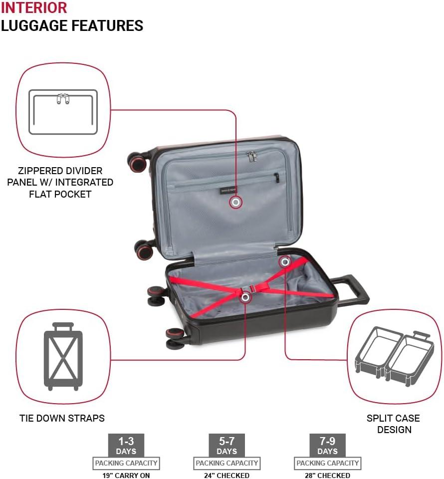 Traveling doesn't have to be a hassle thanks to SwissGear's 8028 Expandable Hard Shell Luggage with Spinner Wheels. Perfect for any trip, this 3-piece hard suitcase set includes an 19″ expandable carry-on suitcase, a 24″ medium suitcase, and a 28″ large suitcase. The durable ABS construction includes co-molded lift handle(s) with soft rubber hand grips, making it both stylish and reliable. 8 360-degree multi-directional spinner wheels and a premium, push-button steel locking telescopic handle make it easy to maneuver the entire set. Each hardshell suitcase features a split-case design that expands 2″ for additional packing space, plus a variety of internal pockets that keep you organized. SwissGear products, including our hardshell luggage sets, are tested to ensure our products meet stringent standards. This hard shell suitcase set comes with a 10-year warranty against defects in materials and workmanship.