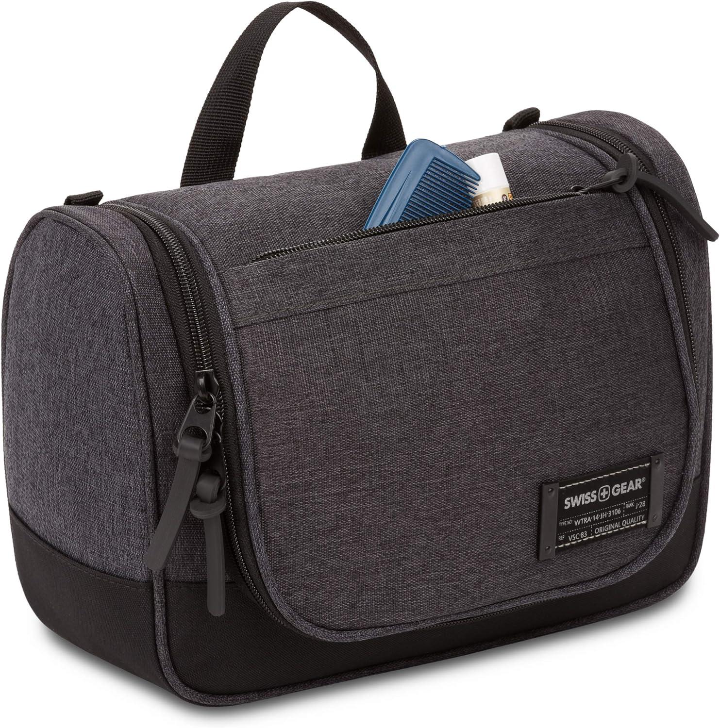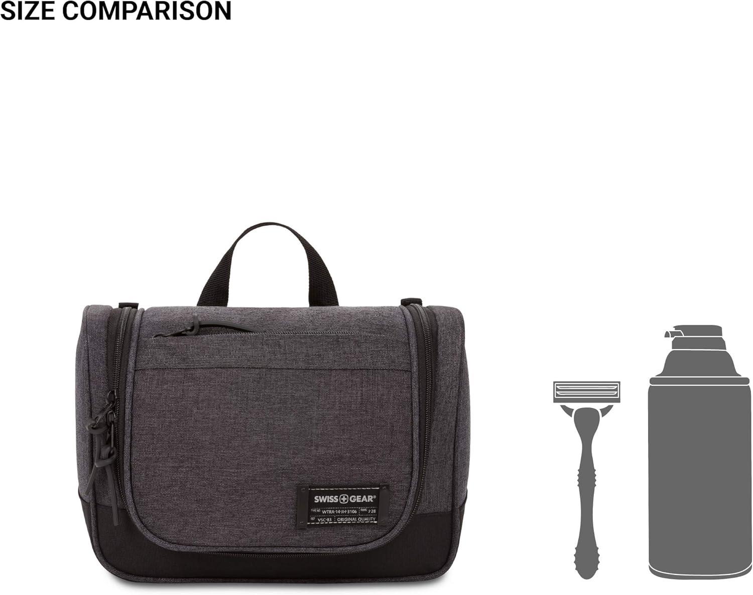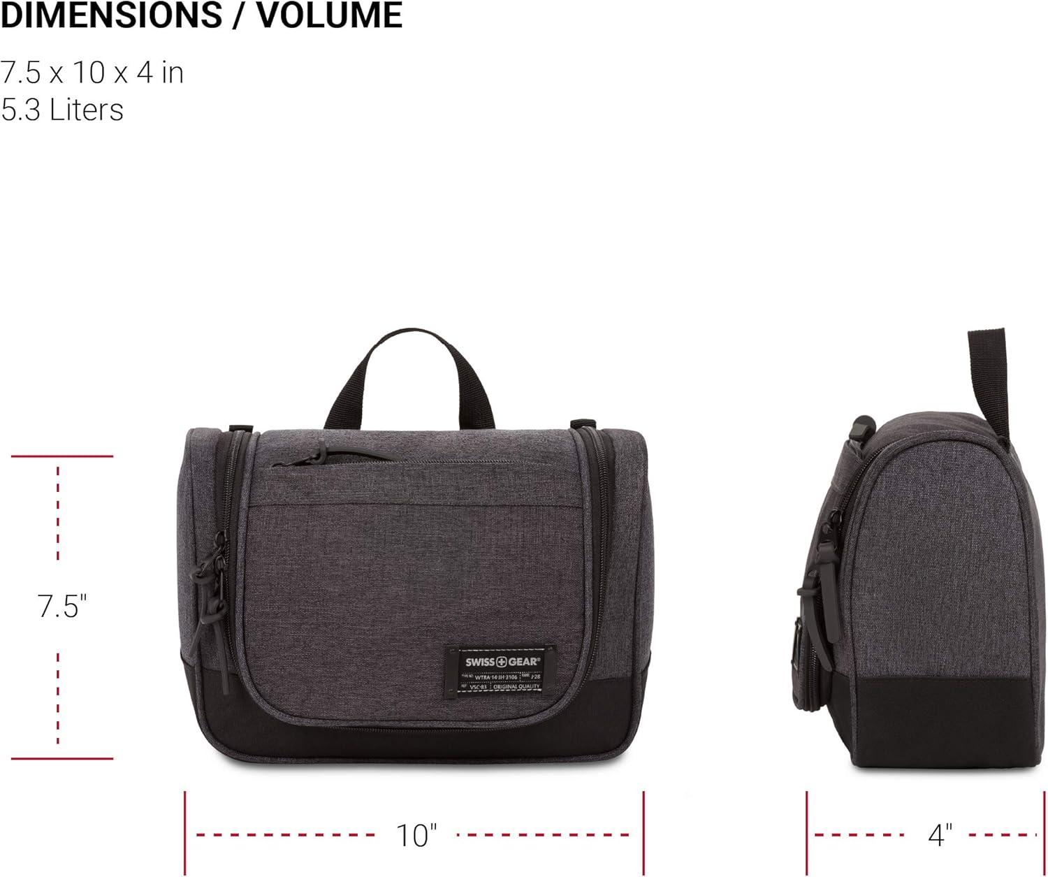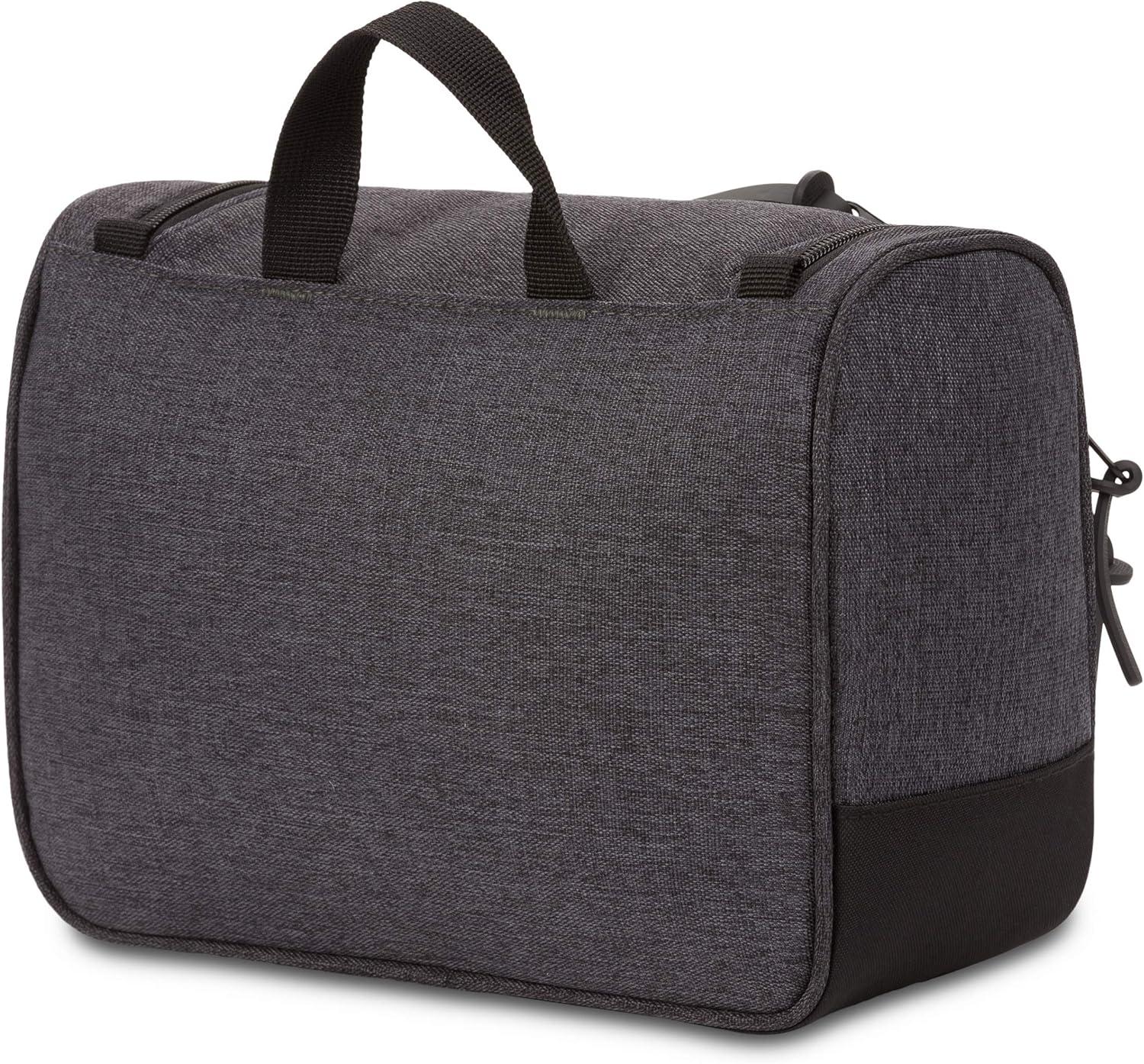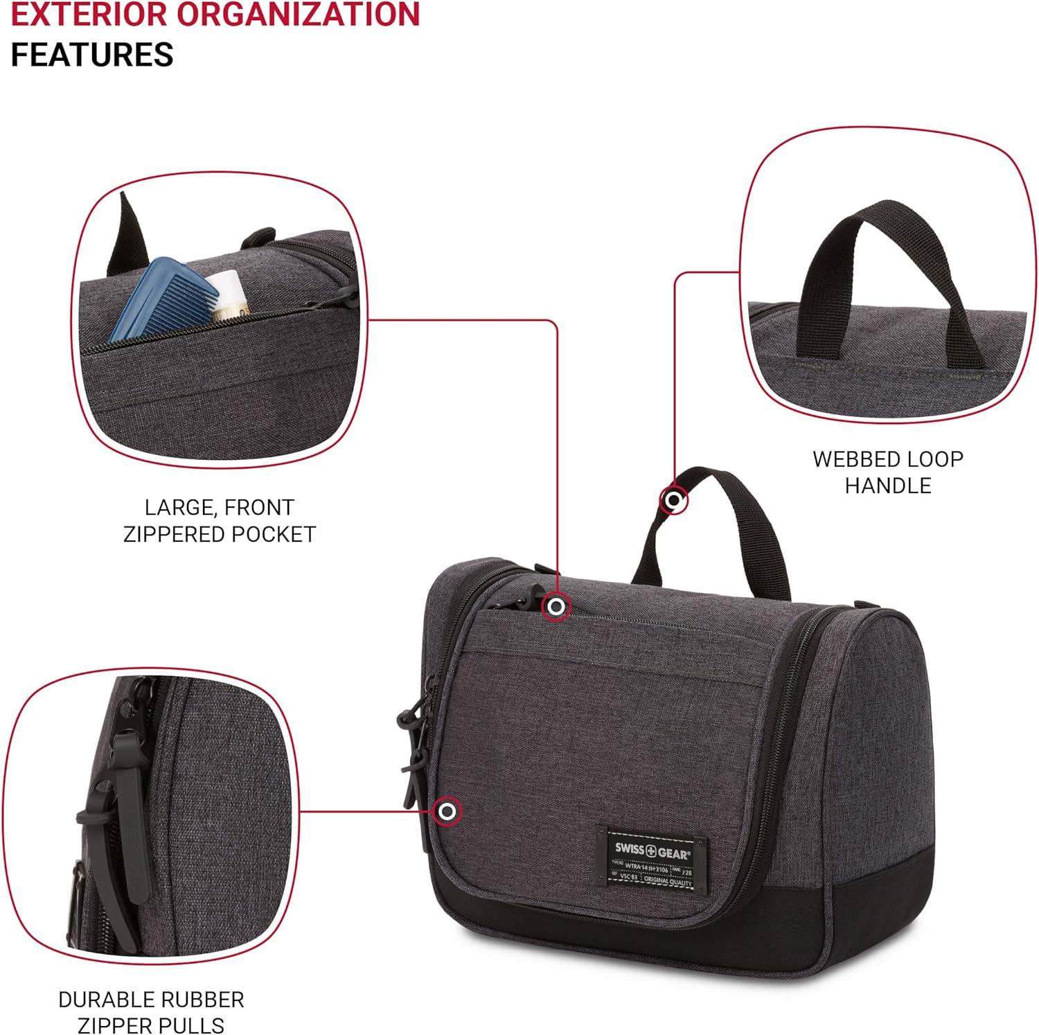 Modernize your travels with the SwissGear 2379 Hanging Toiletry Kit. Unzip its horseshoe opening and organize your travel-sized bottles in its internal elastic strap system and integrated zip pocket. Lay smaller things within its center compartment, which contains a mesh barrier to keep liquids from spilling over. And find two convenient side slip pockets for your razor and other small but important necessities. And save valuable countertop space by using the built-in hanger hook.