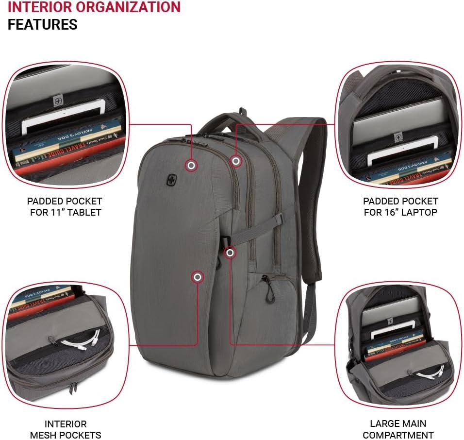 Everyday, everywhere, the SwissGear VersaMax Laptop Backpack, 16-Inch Laptop Backpack carries everything you need without weighing you down. Made to protect your laptop, work, and travel, tablet, eyewear, and other essentials, this backpack features built-in, organized storage inside out and designated spaces for your files, books, water bottle, keys, phones, and more. Stay cool and comfortable whether you carry or wear it. With integrated comfort features, this backpack is perfect for the busy professional, college student, or anyone commuting from work or school to home. This backpack is ideal for commuters, travelers, and students seeking convenience and style with enhanced organization.