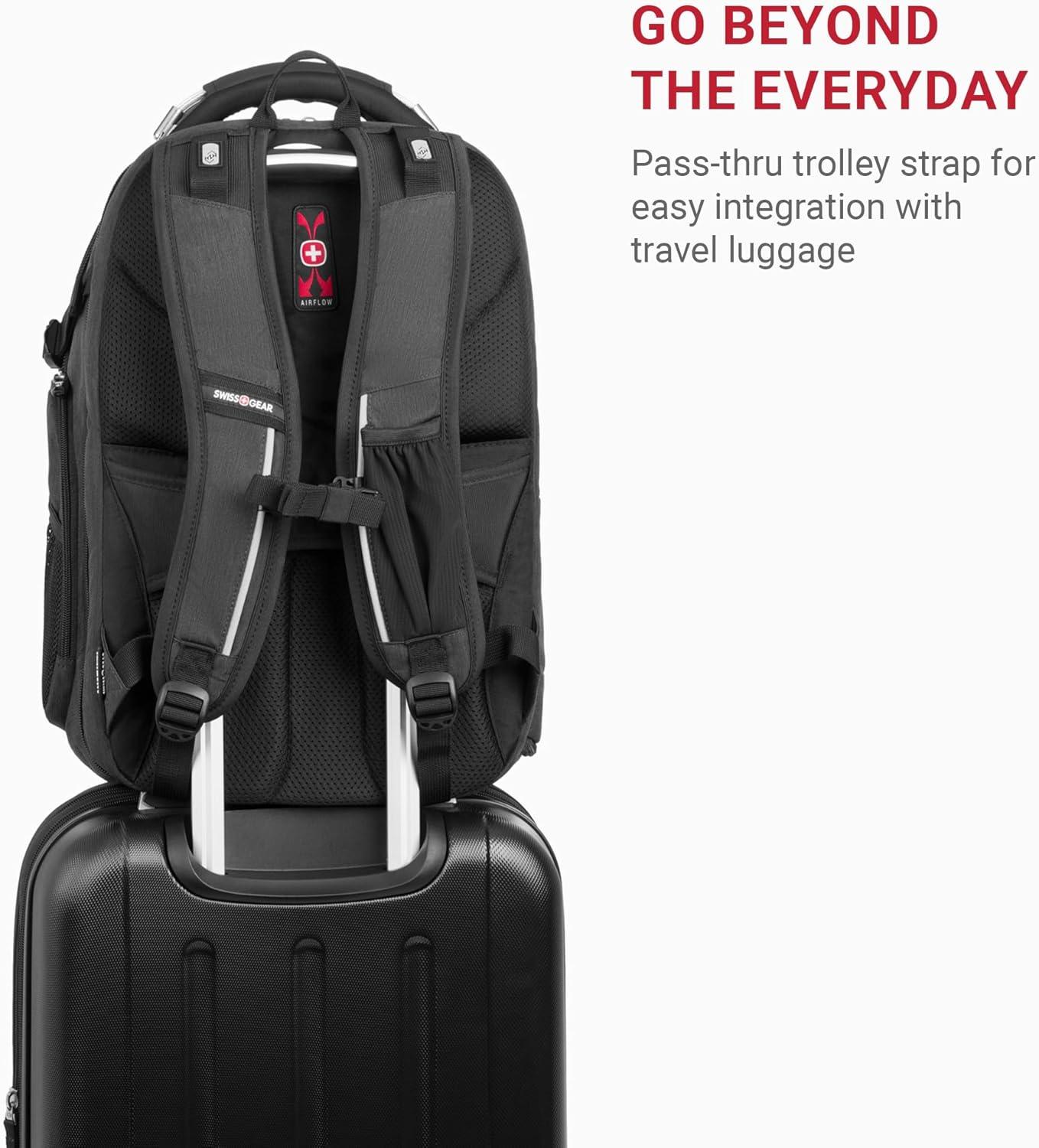 The SwissGear 5358 Travel Tech Elite USB Laptop Backpack is built for modern travelers who need smart, organized storage for their devices and essentials. Designed with a TSA-friendly ScanSmart compartment, it fits laptops up to 16” and tablets up to 11”, laying flat to breeze through airport security. A built-in USB port offers convenient pass-thru charging on the go (power bank not included). Stay organized with multiple compartments, including a padded laptop/tablet area, accessory pockets for electronics and pens, and a dedicated space for shoes or gym gear. Dual water bottle pockets, exterior quick-access pockets, and compression straps keep everything secure and within reach. For all-day comfort, the bag features an Airflow back panel, padded mesh shoulder straps, and a wire-reinforced top handle for easy lifting. A trolley strap allows for effortless stacking on rolling luggage. Backed by a 10-year warranty, this backpack combines smart tech features with SwissGear’s trusted durability.